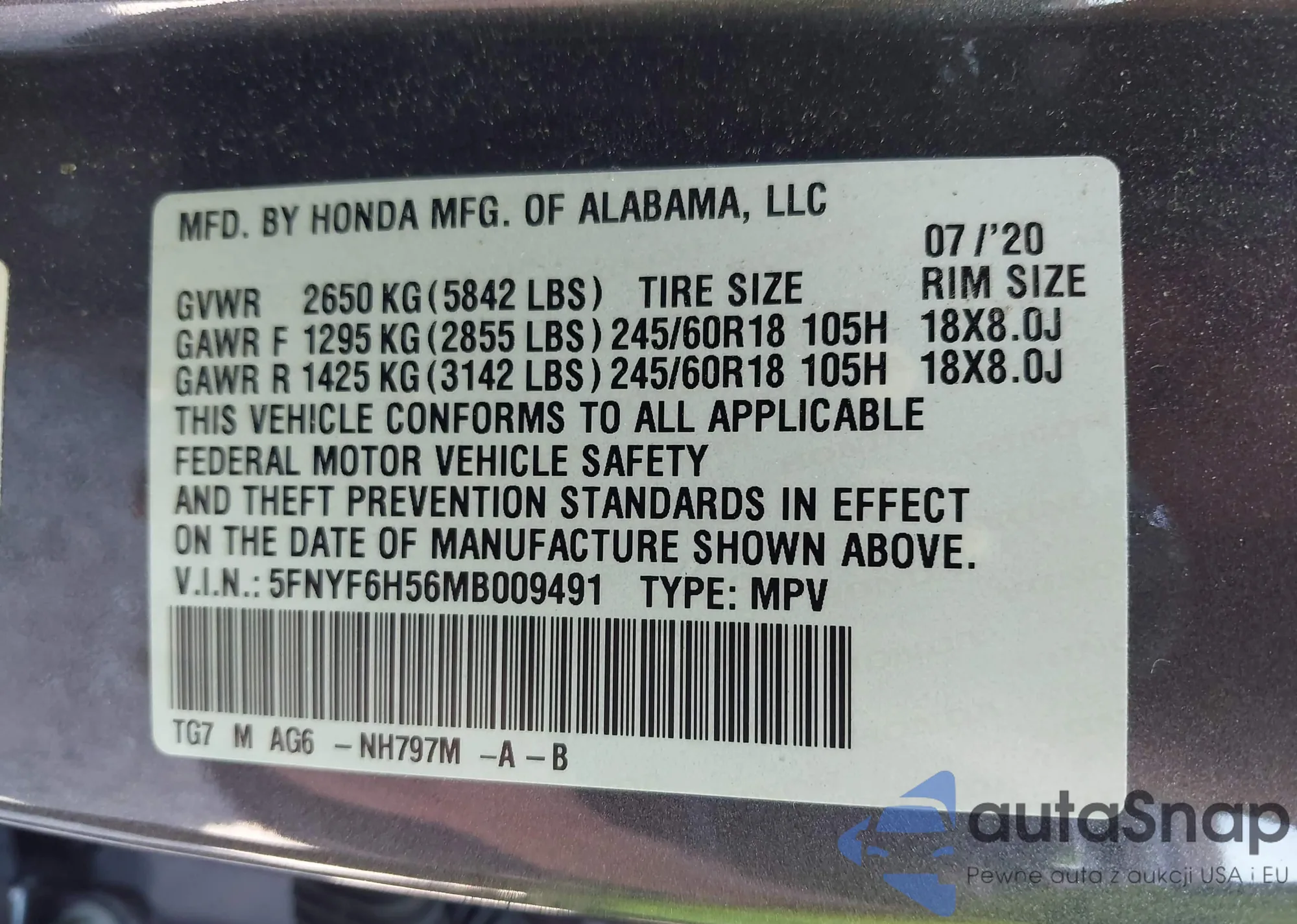 • VIN 2HGFC2F87MH536764