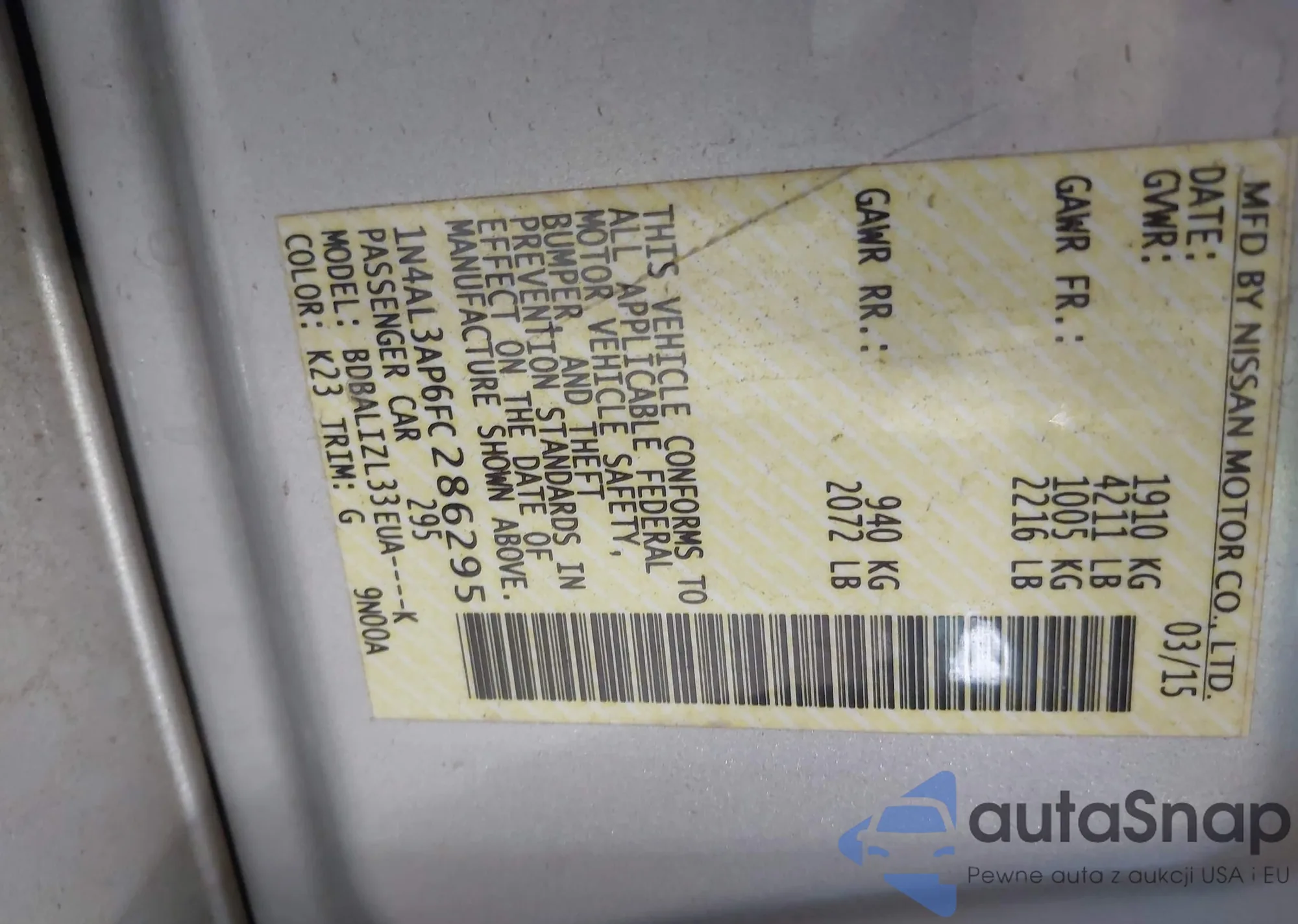 LOT: 42620618 VIN: 1N4AL3AP6FC286295