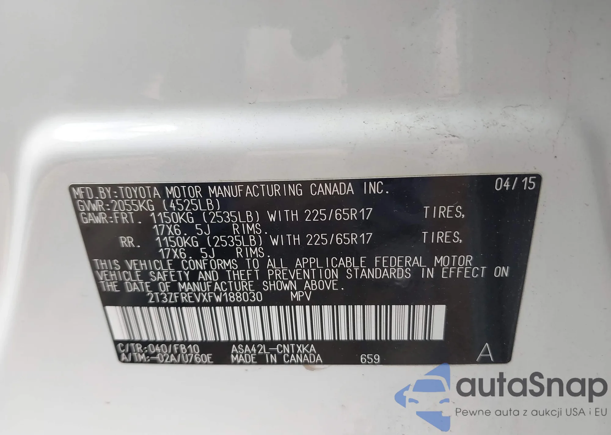 LOT: 42894671 VIN: 2T3ZFREVXFW188030