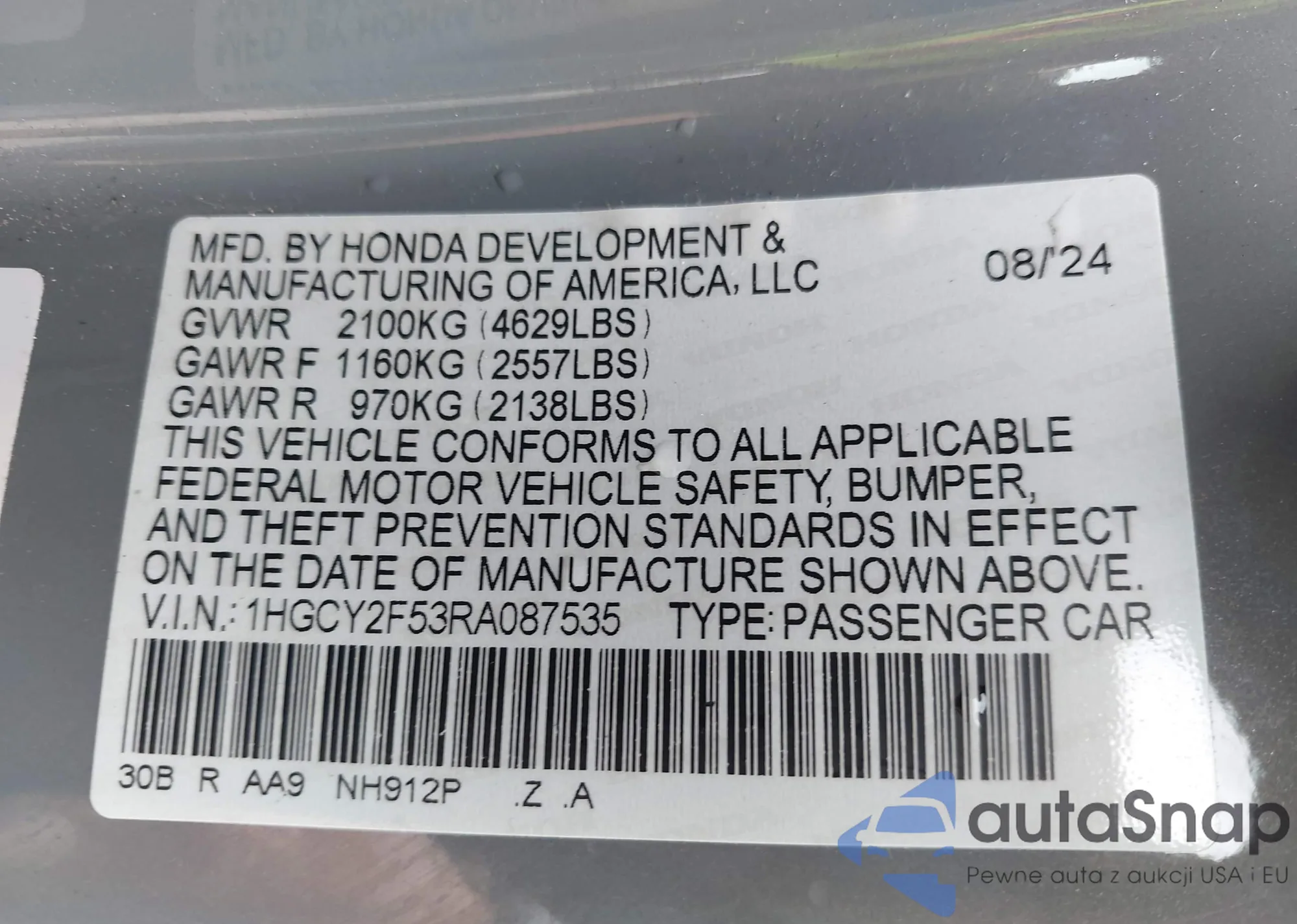 LOT: 42676224 VIN: 1HGCY2F53RA087535