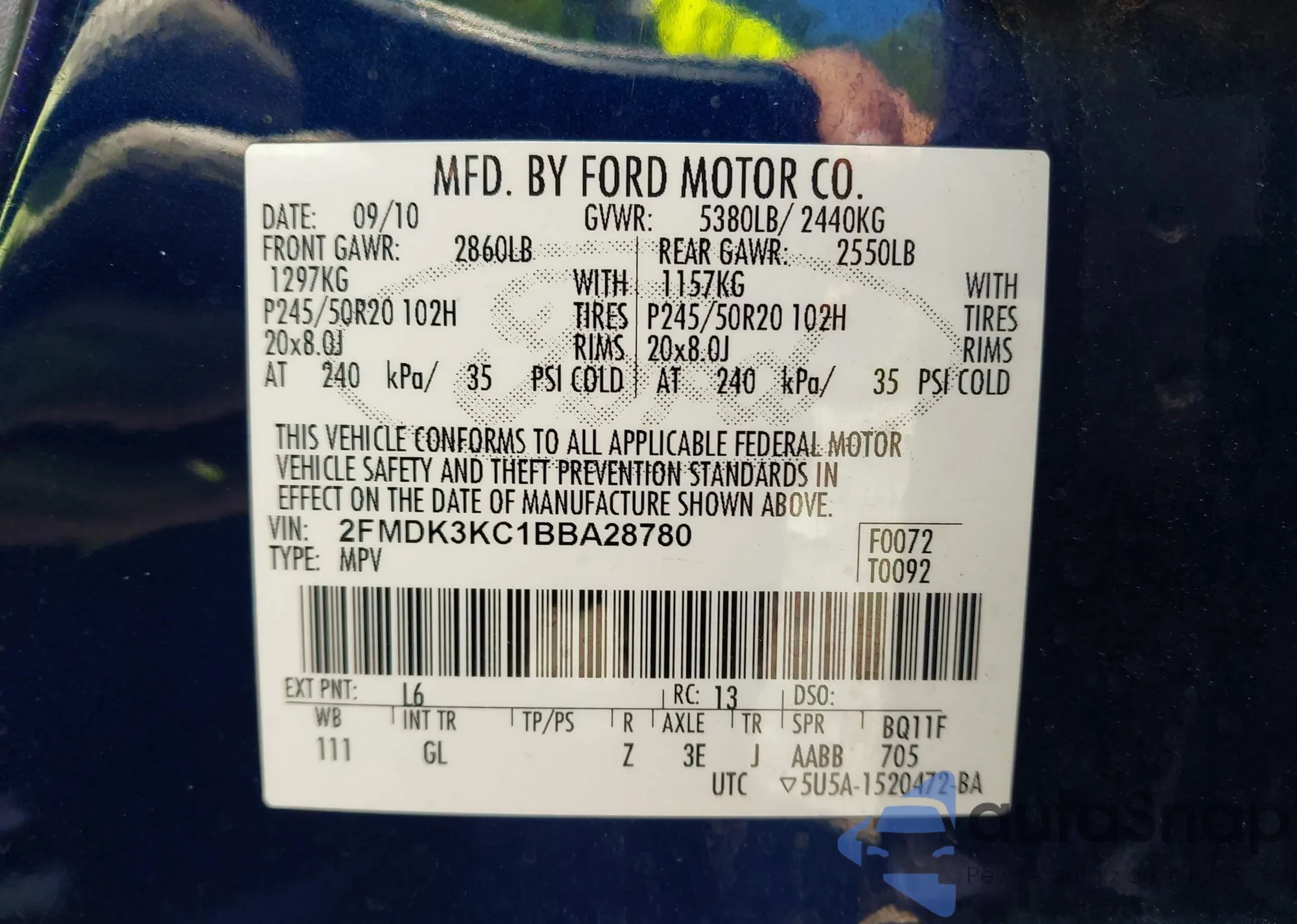 • VIN 2FMDK3KC1BBA28780