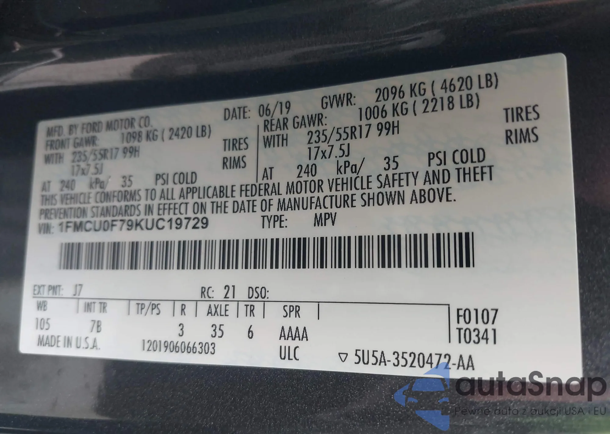 LOT: 42804578 VIN: 1FMCU0F79KUC19729
