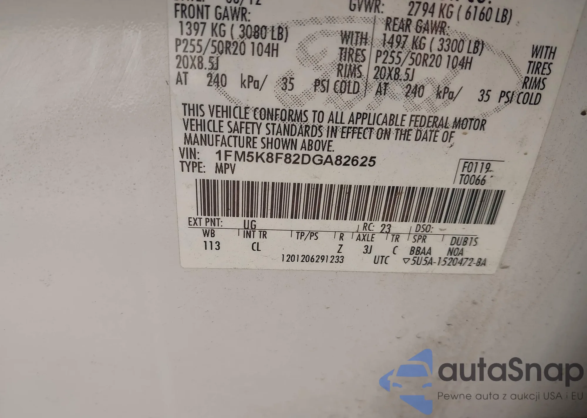 LOT: 42824508 VIN: 1FM5K8F82DGA82625