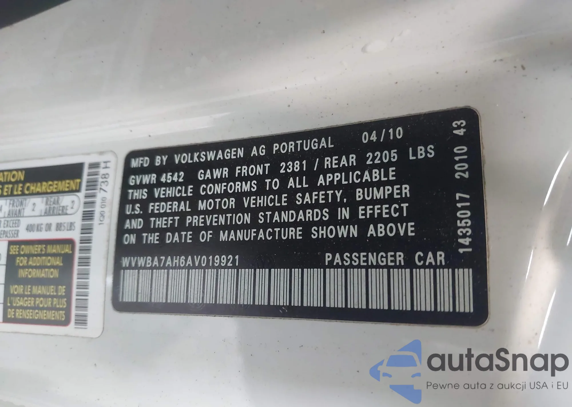• VIN WVWBA7AH6AV019921