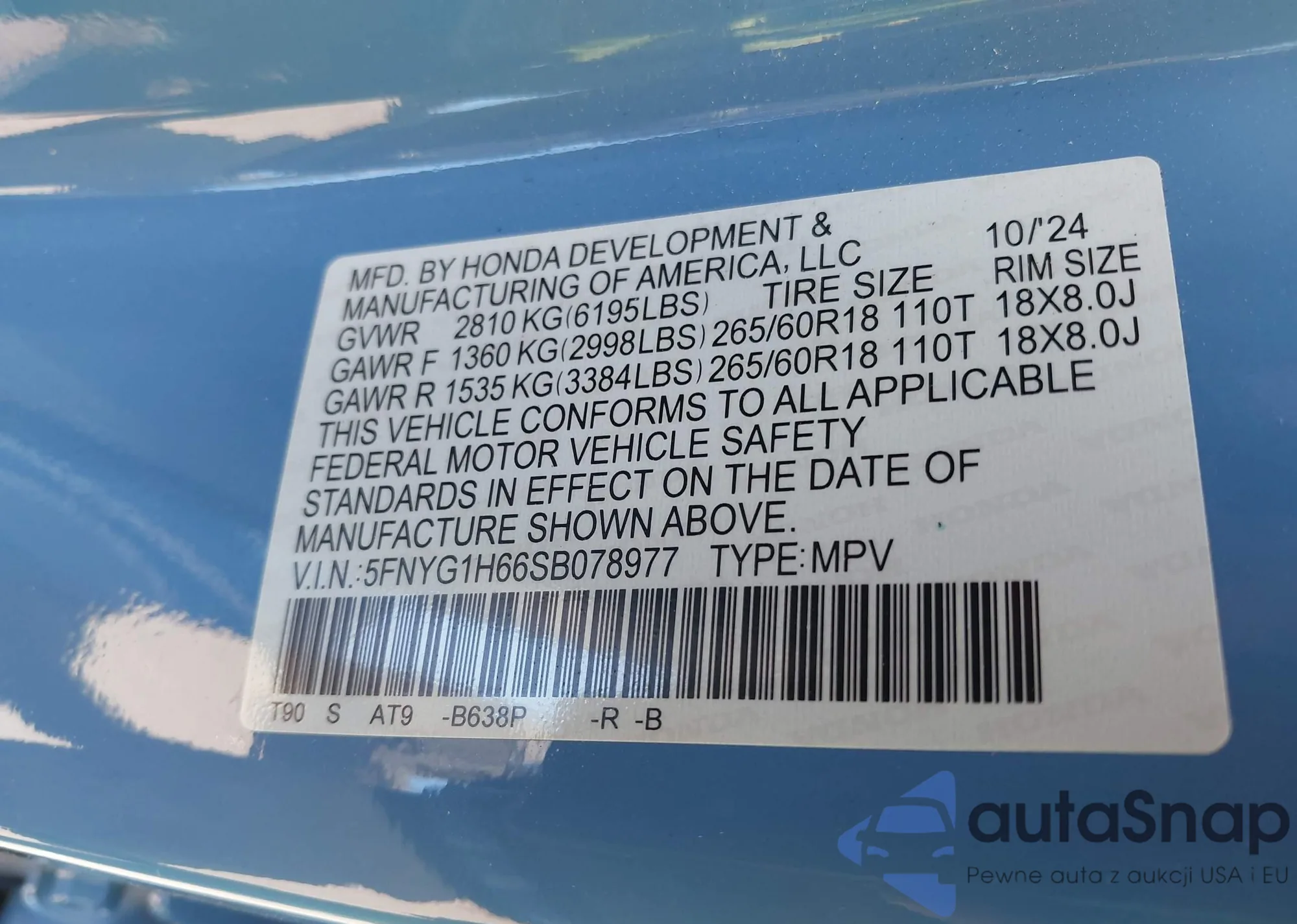 • VIN 5FNYG1H66SB078977