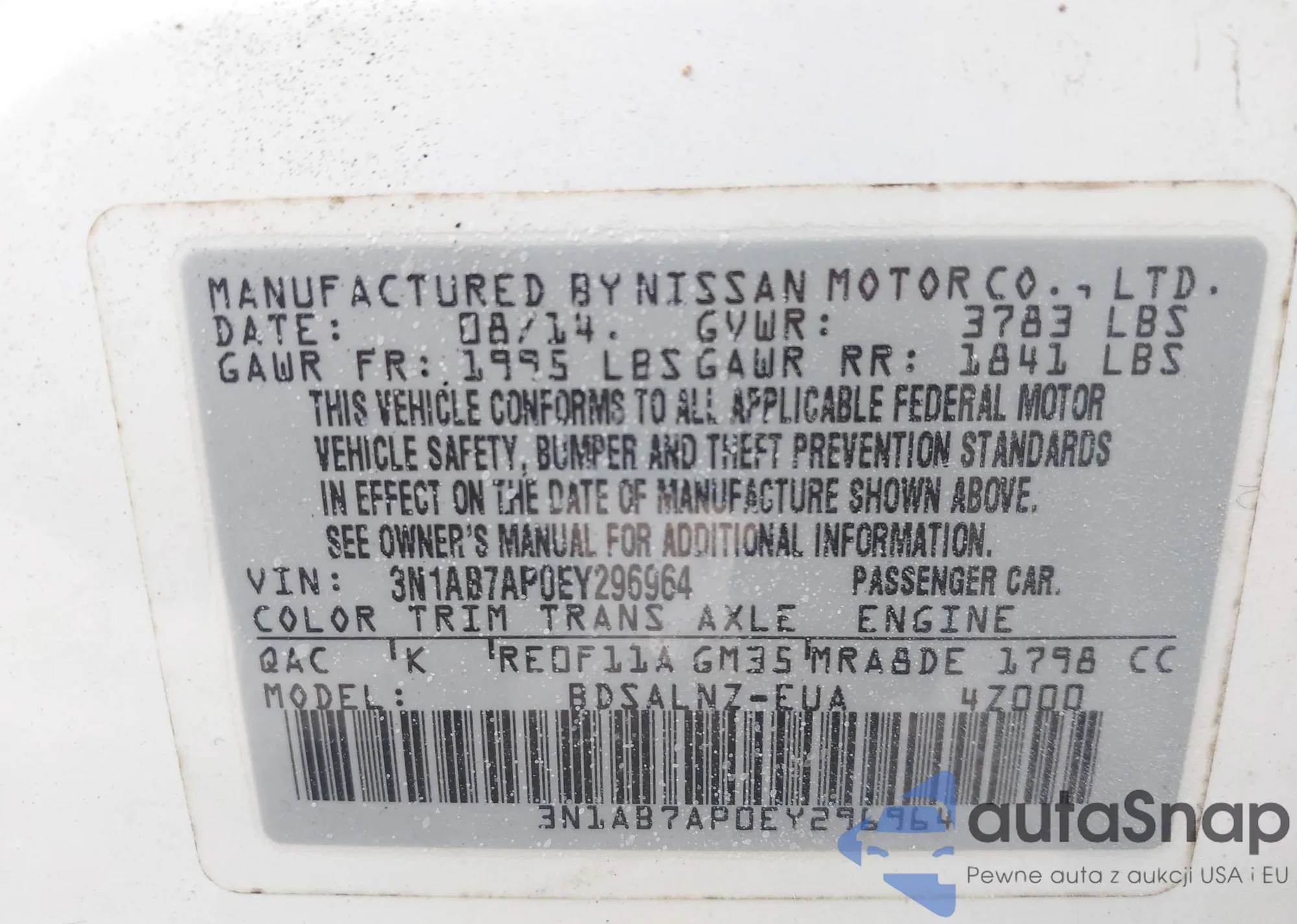 LOT: 42951522 VIN: 3N1AB7AP0EY296964