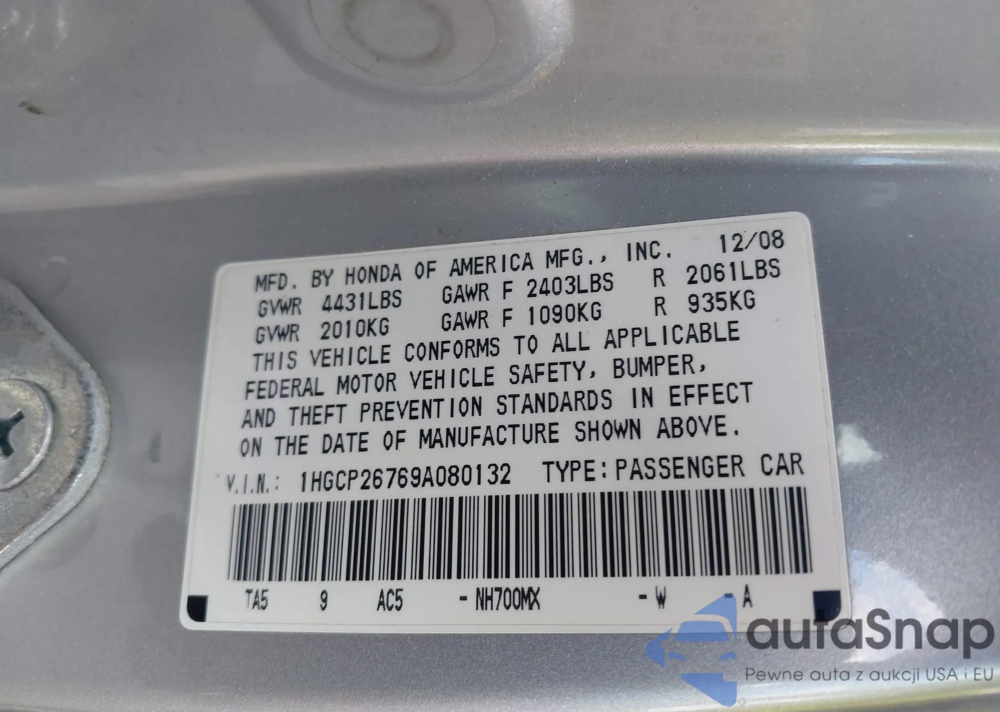 LOT: 43091846 VIN: 1HGCP26769A080132