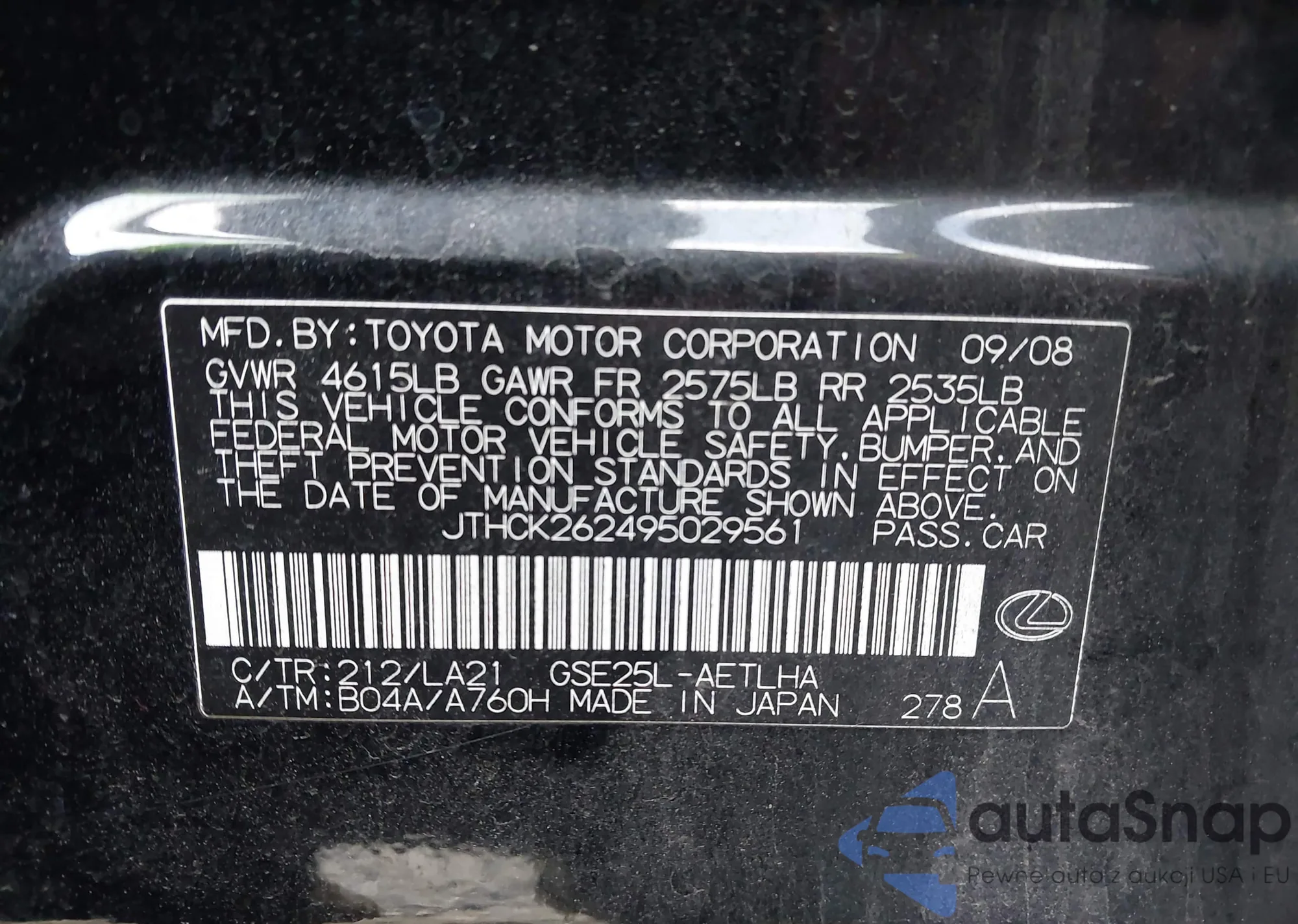 LOT: 41226221 VIN: JTHCK262495029561