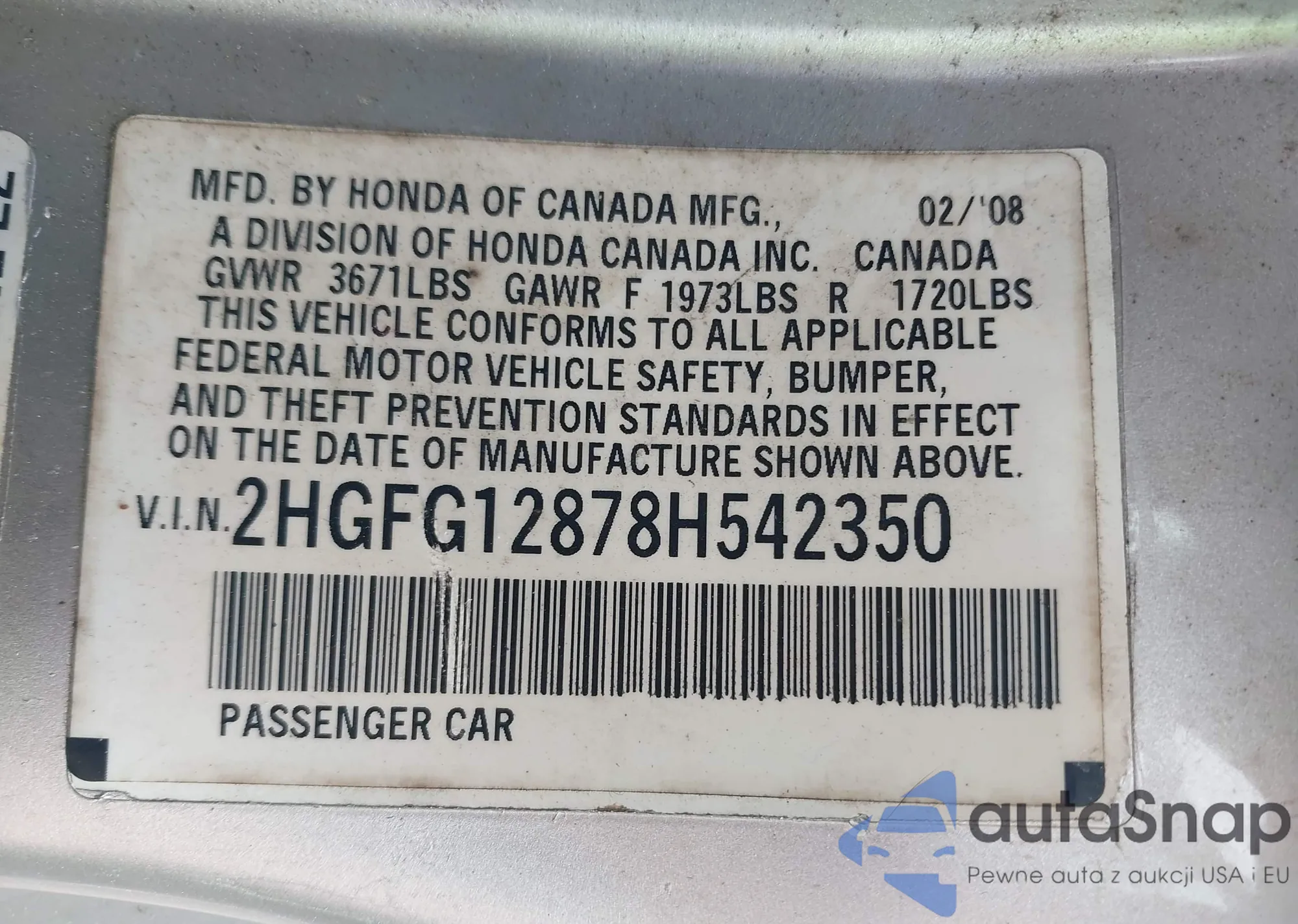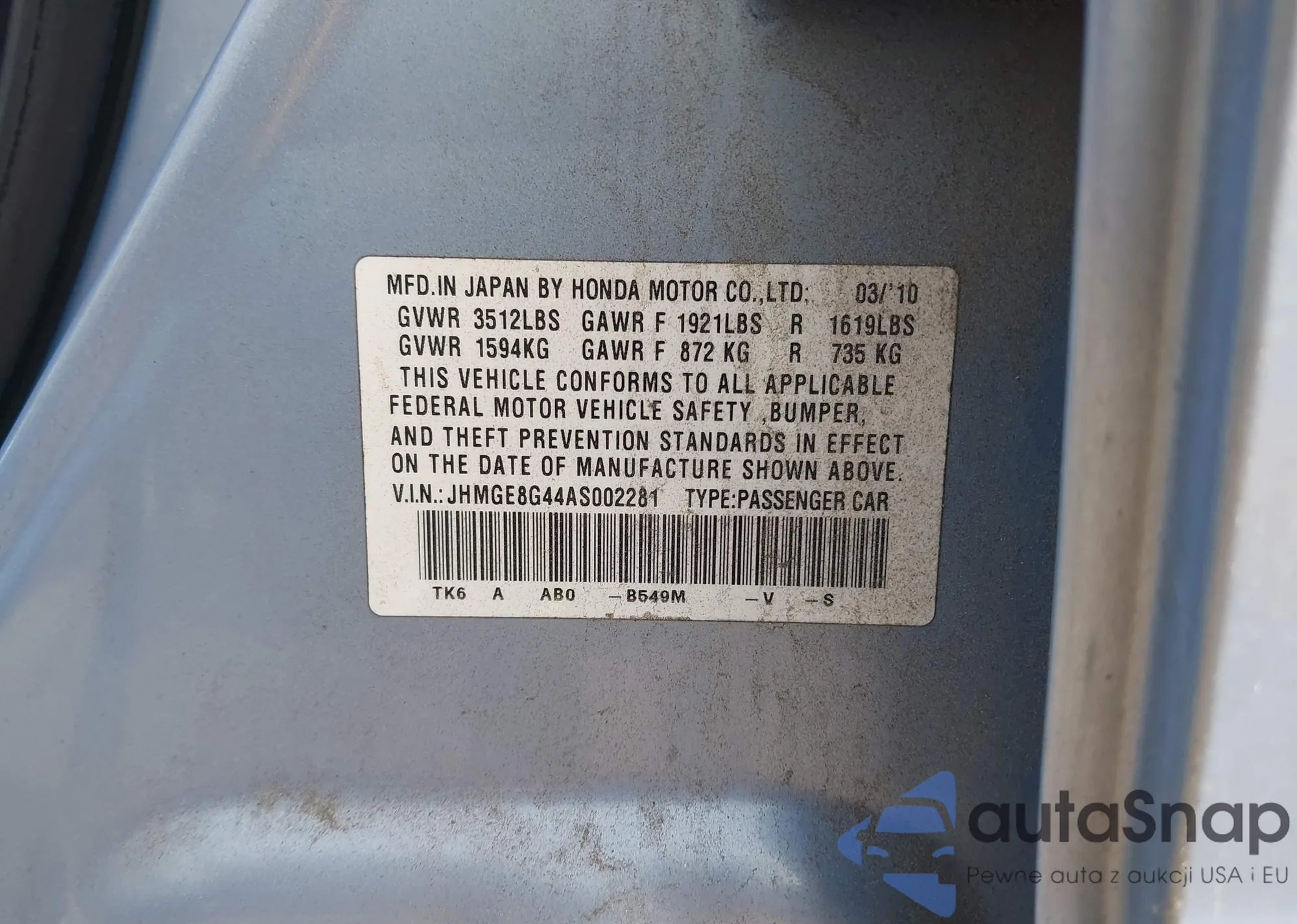 LOT: 43168538 VIN: JHMGE8G44AS002281