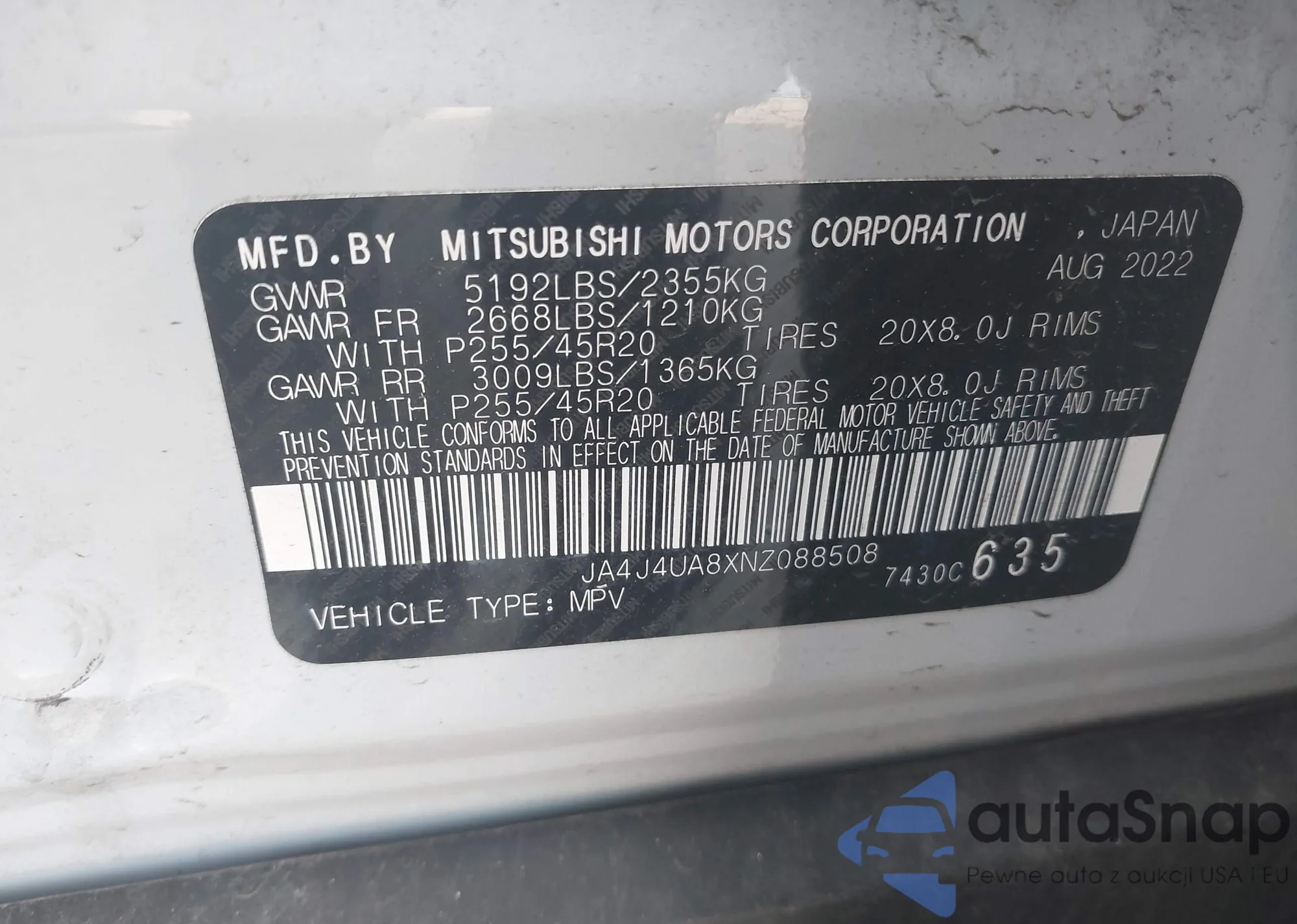 LOT: 42940121 VIN: JA4J4UA8XNZ088508