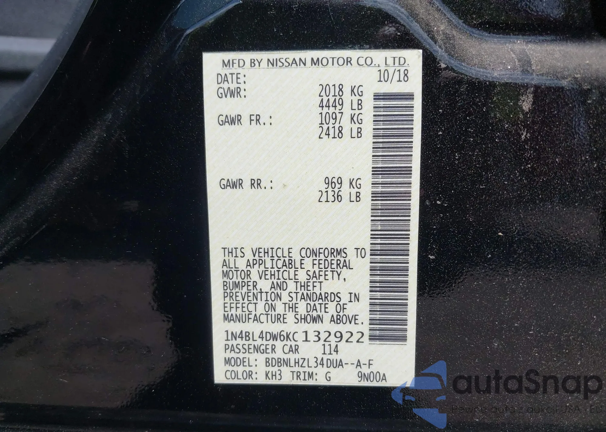 • VIN 1N4BL4DW6KC132922