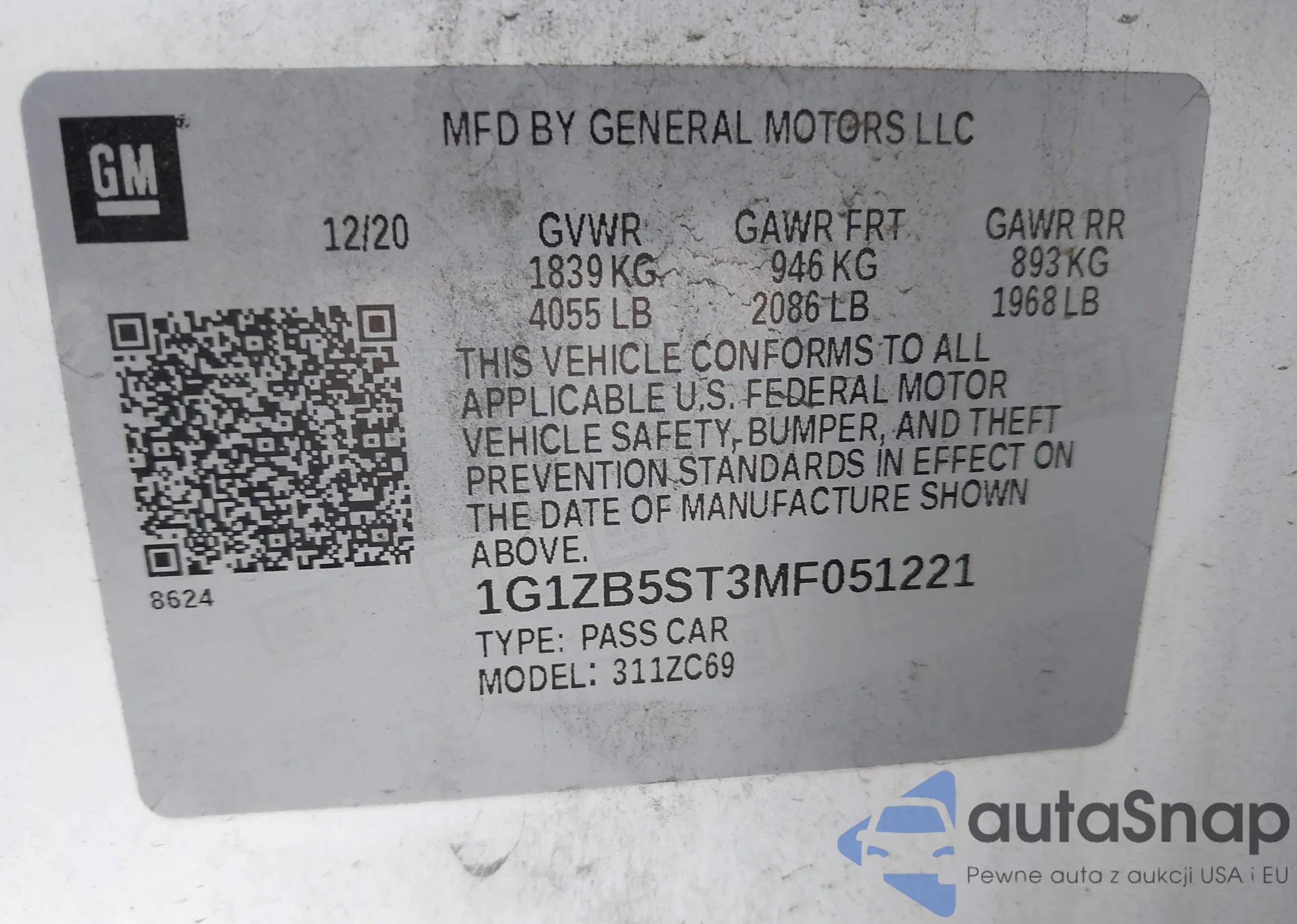 LOT: 42920934 VIN: 2G1WF55E0Y9301906