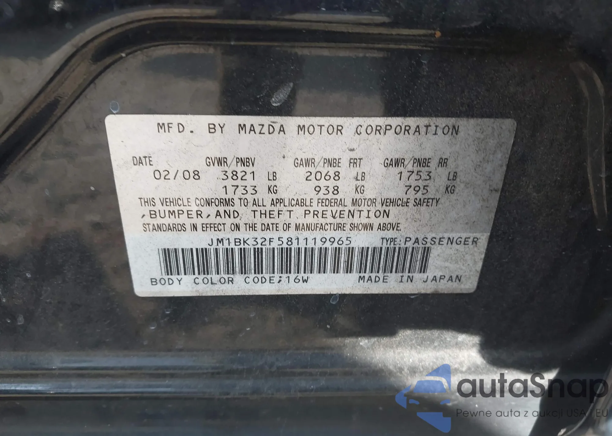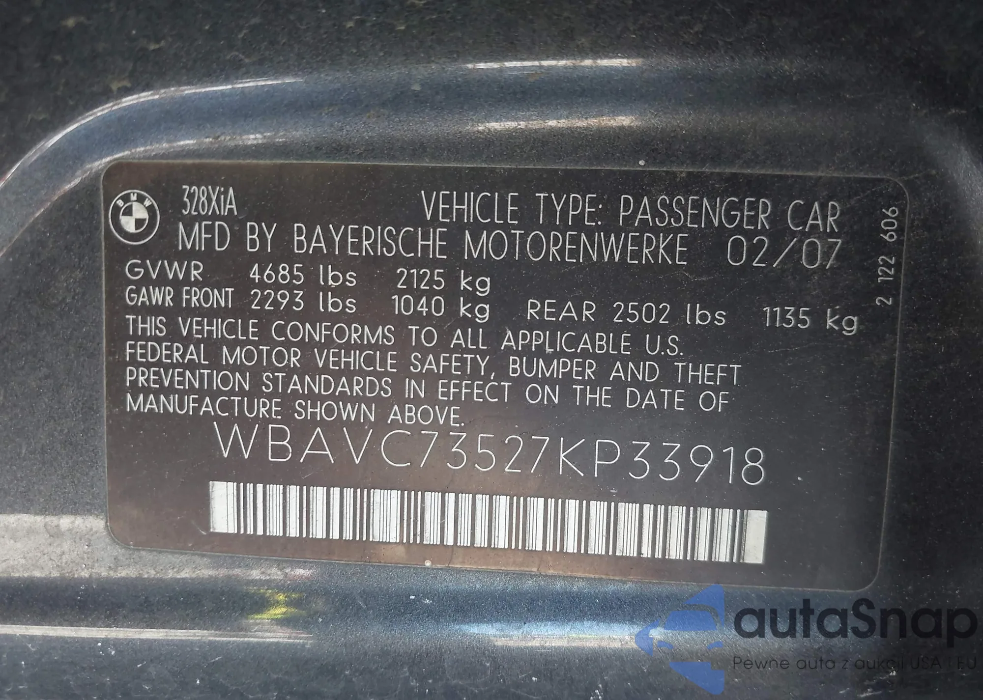 LOT: 43006191 VIN: WBAVC73527KP33918