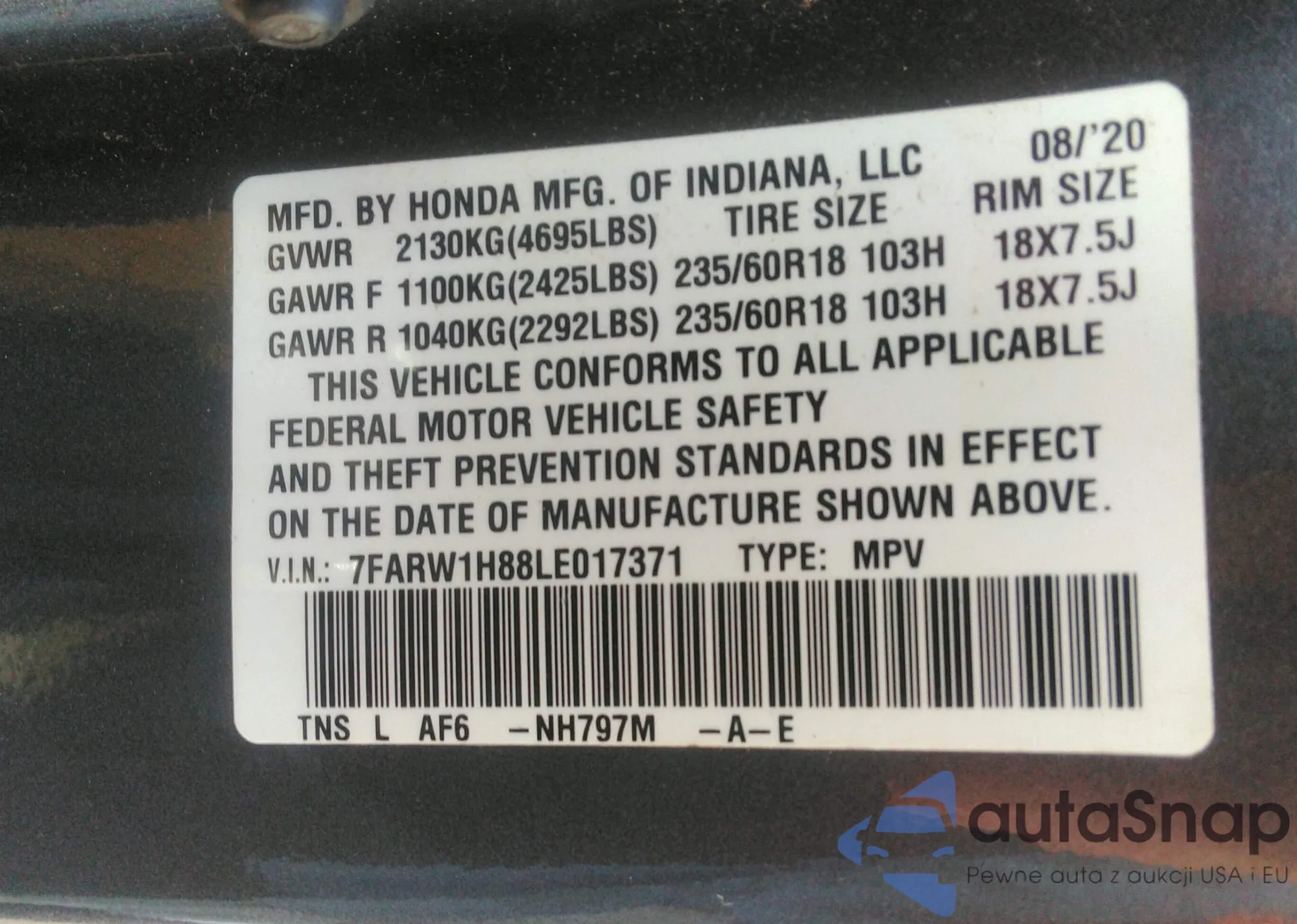 • VIN 2HKRM4H57FH654749