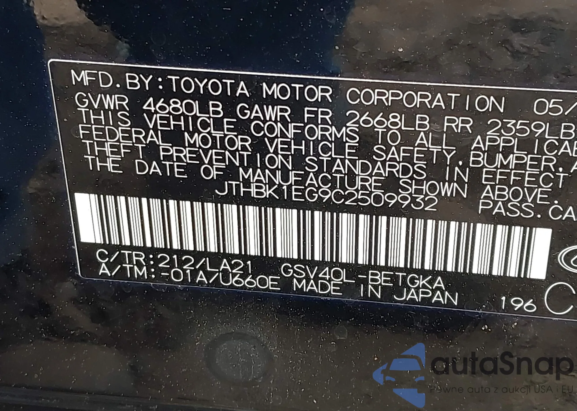 LOT: 43091445 VIN: JTHBK1EG9C2509932