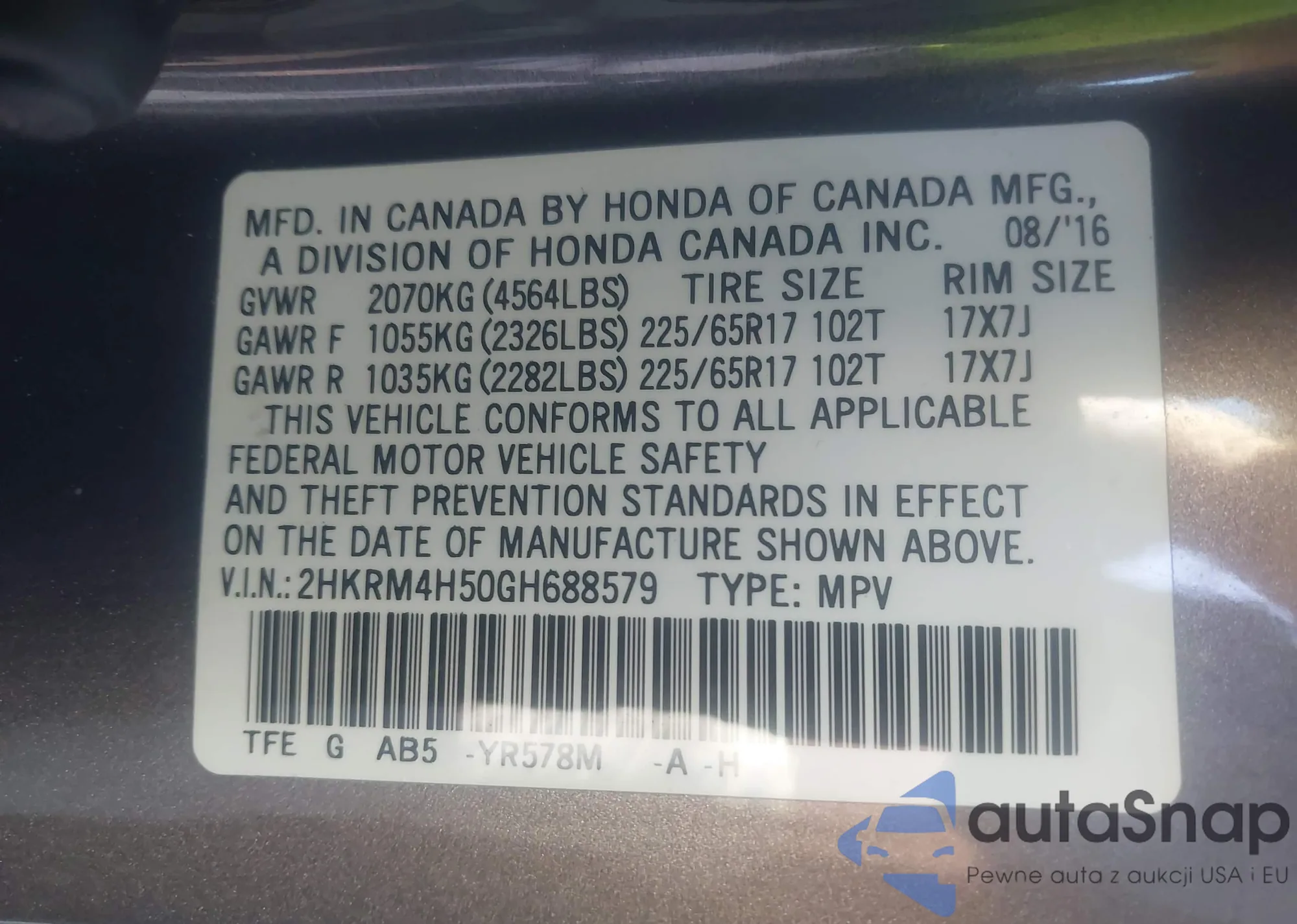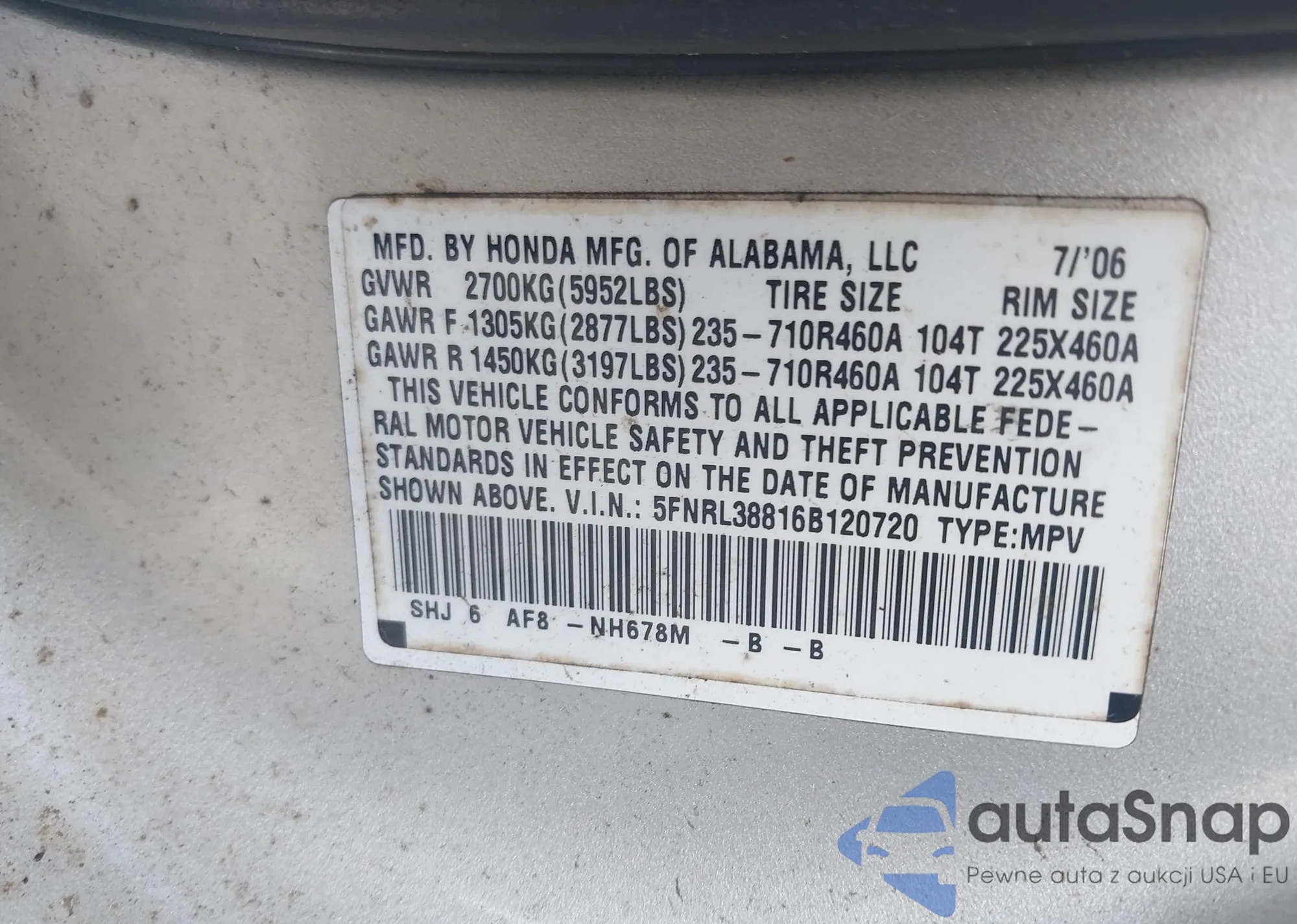 LOT: 42845758 VIN: 5FNRL38816B120720
