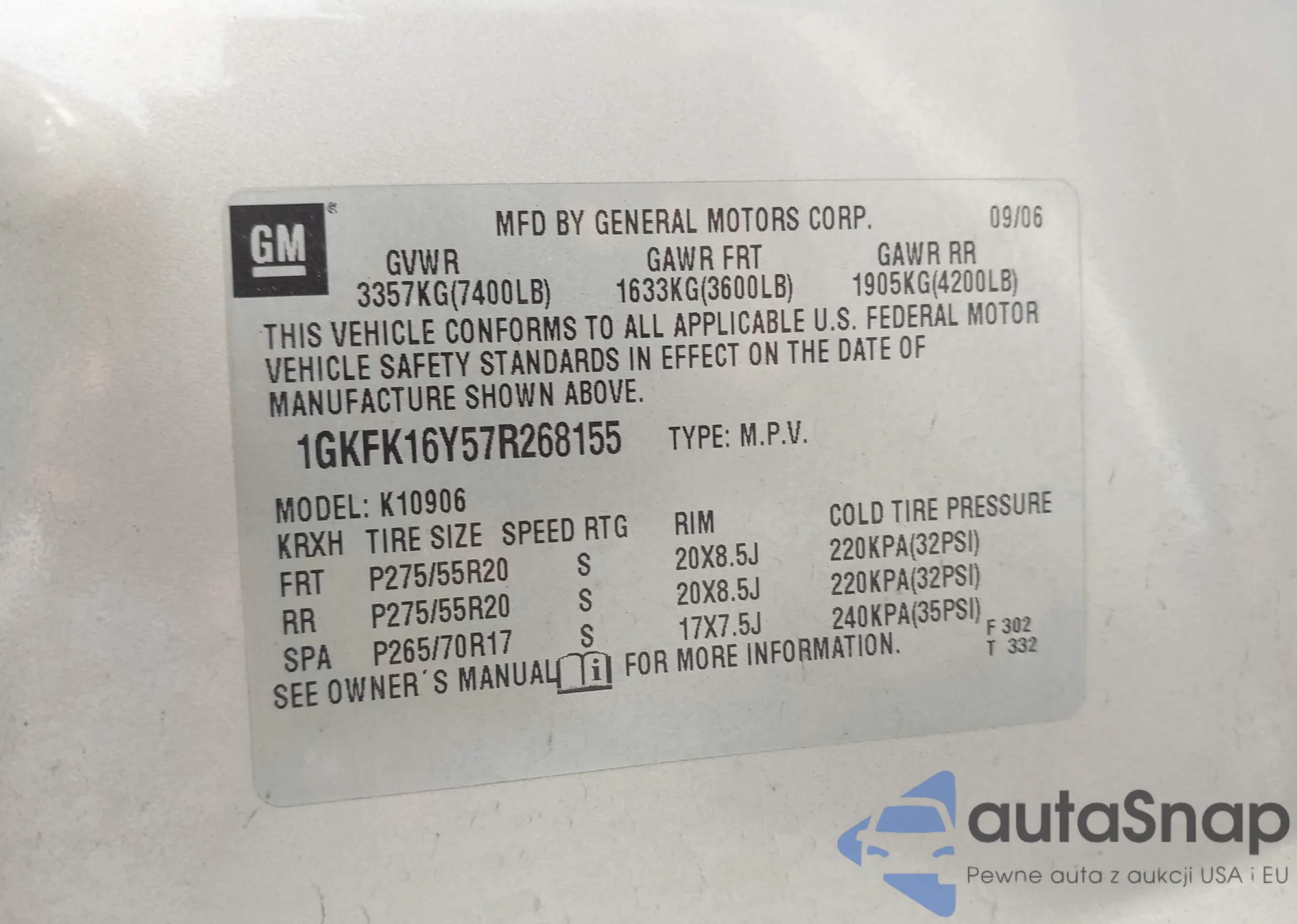 • VIN 1GKFK16Y57R268155