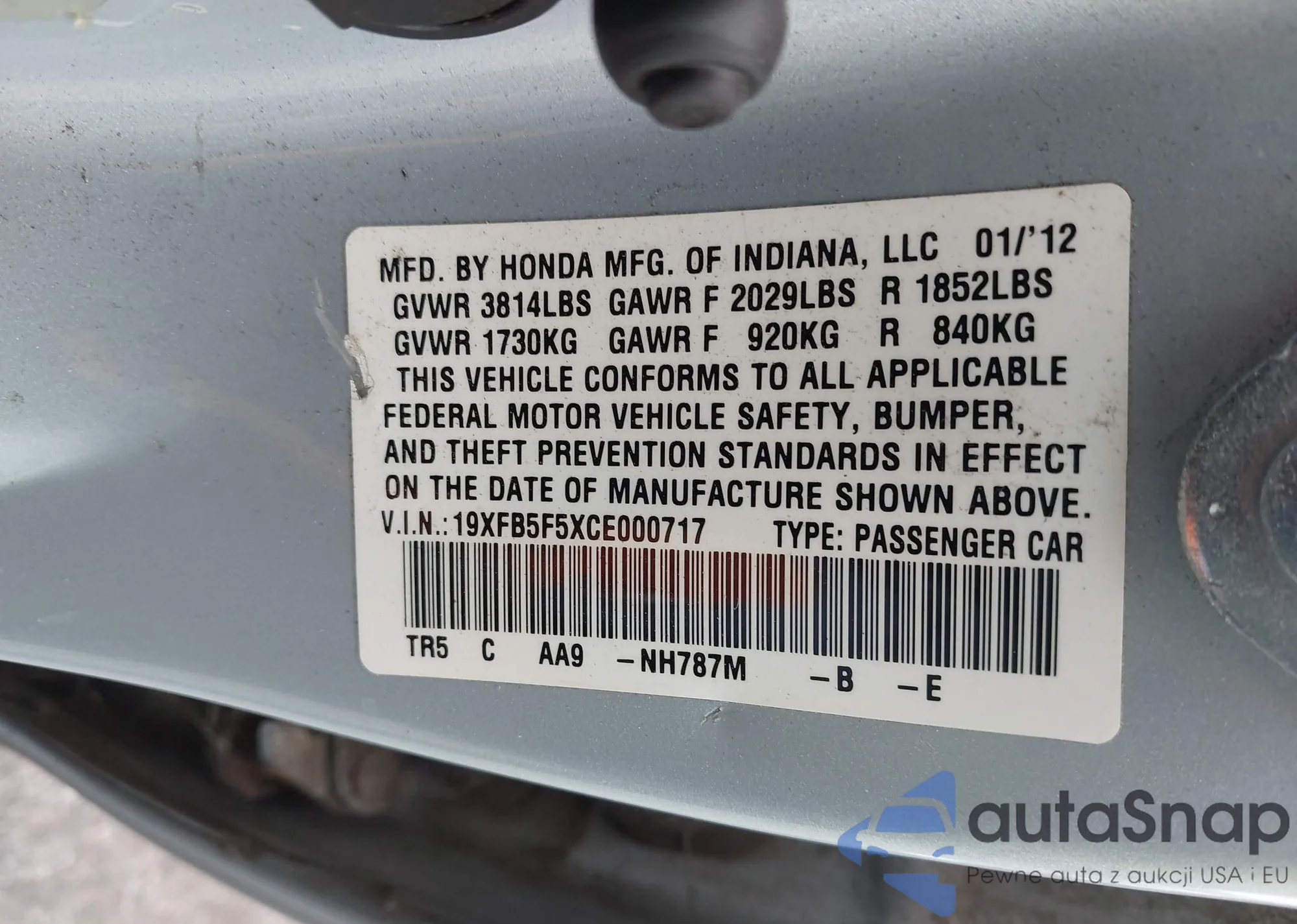 • VIN 19XFB5F5XCE000717