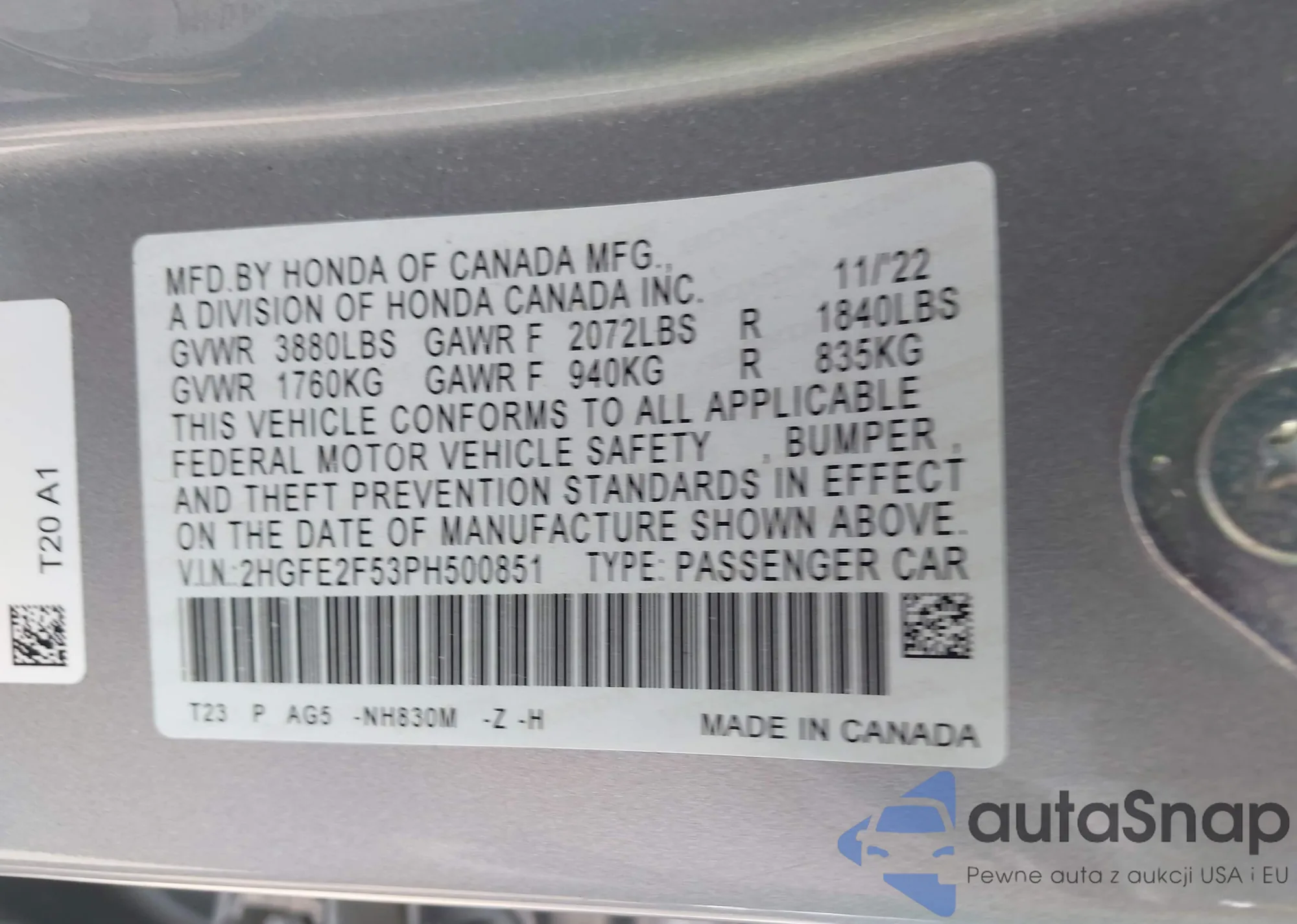 • VIN 2HGFE2F53PH500851