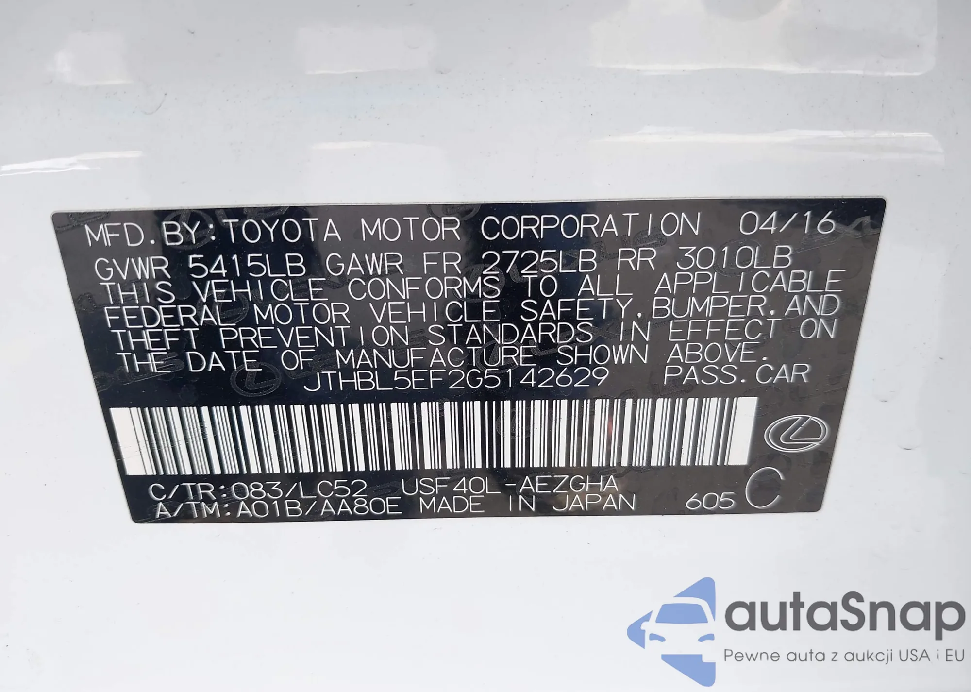 LOT: 43089901 VIN: JTHBL5EF2G5142629