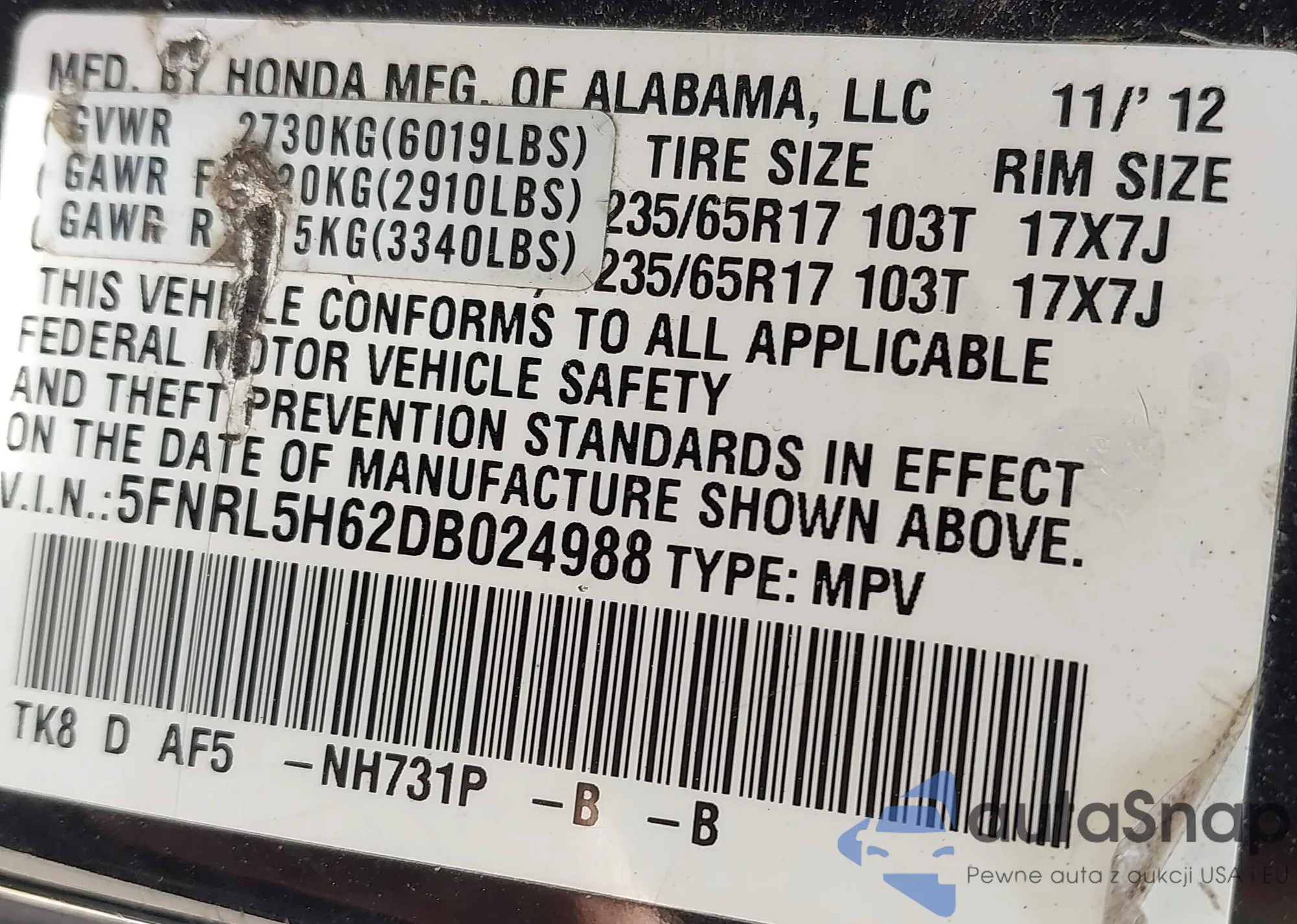 • VIN 5FNRL5H62DB024988