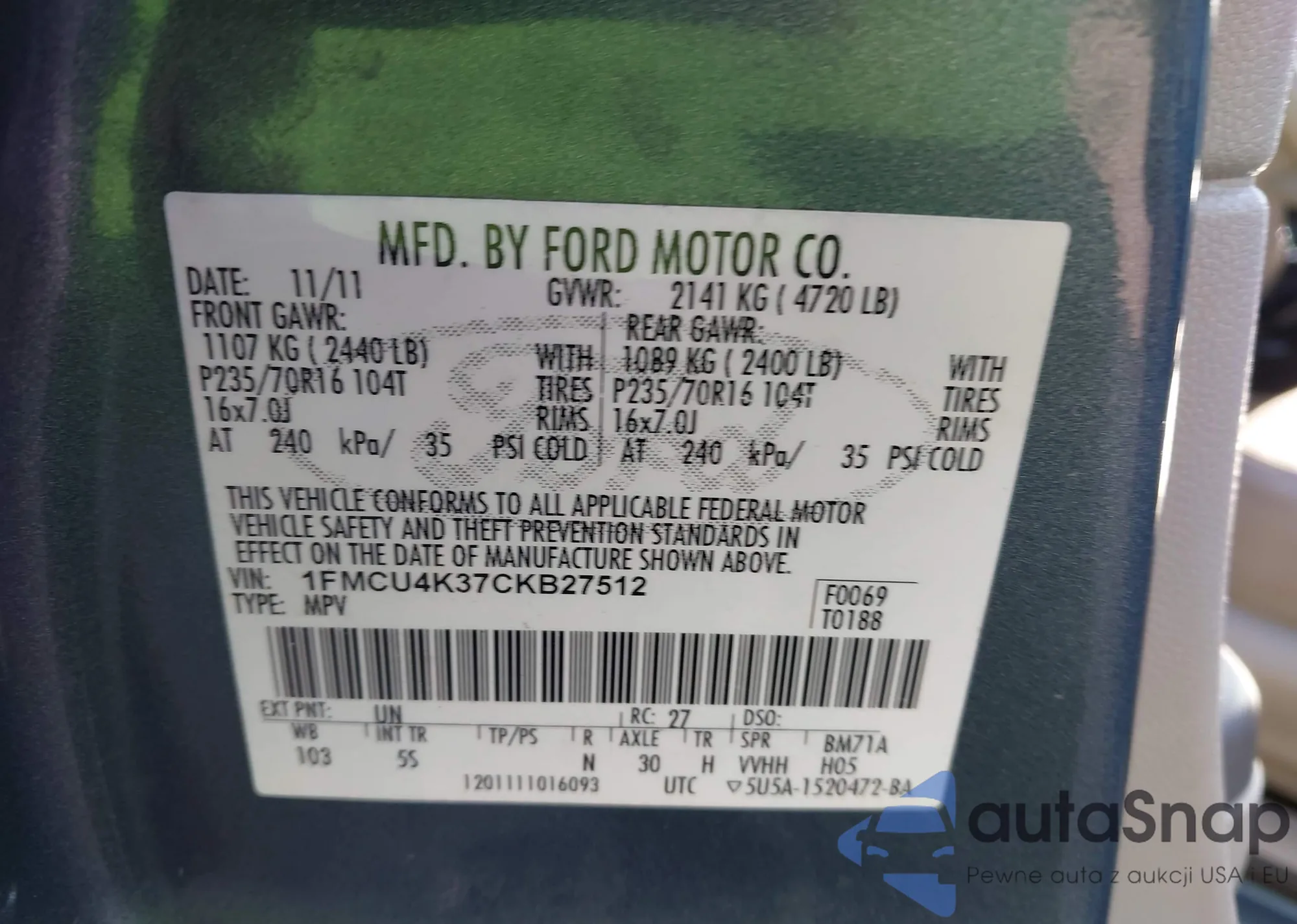 • VIN 1FMCU4K37CKB27512