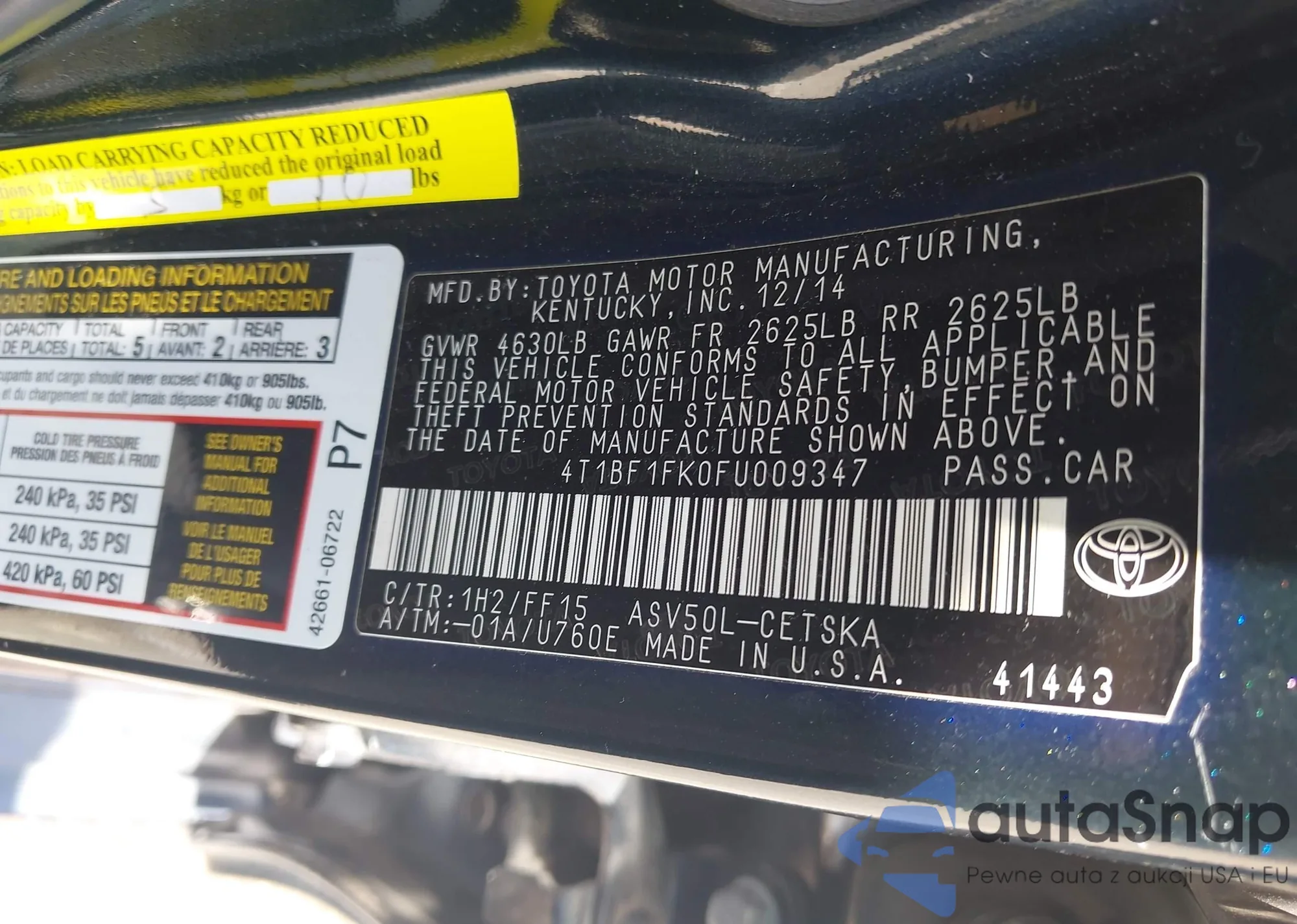 LOT: 42805399 VIN: 4T1BF1FK0FU009347