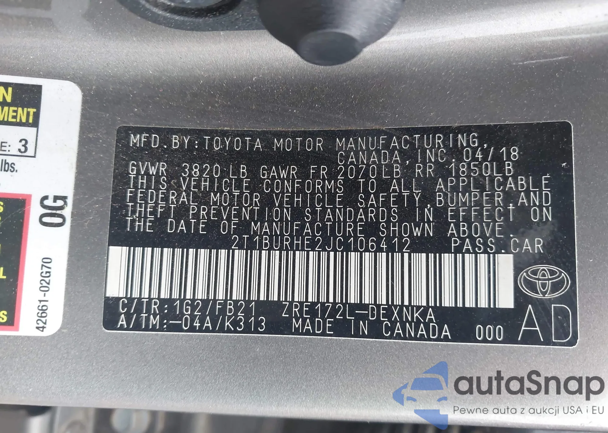 LOT: 42085077 VIN: 2T1BURHE7JC086920