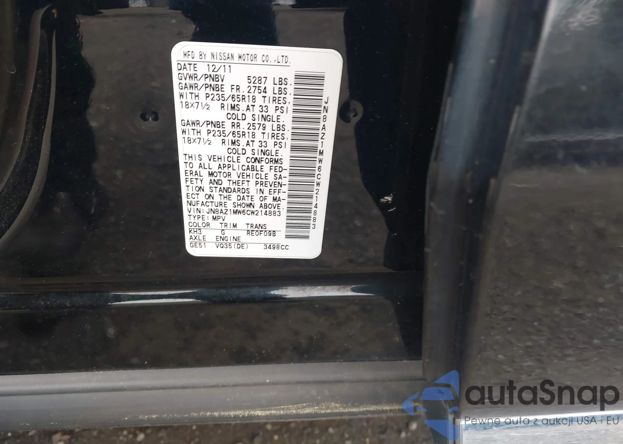 LOT: 42999707 VIN: JN8AZ1MW6CW214883