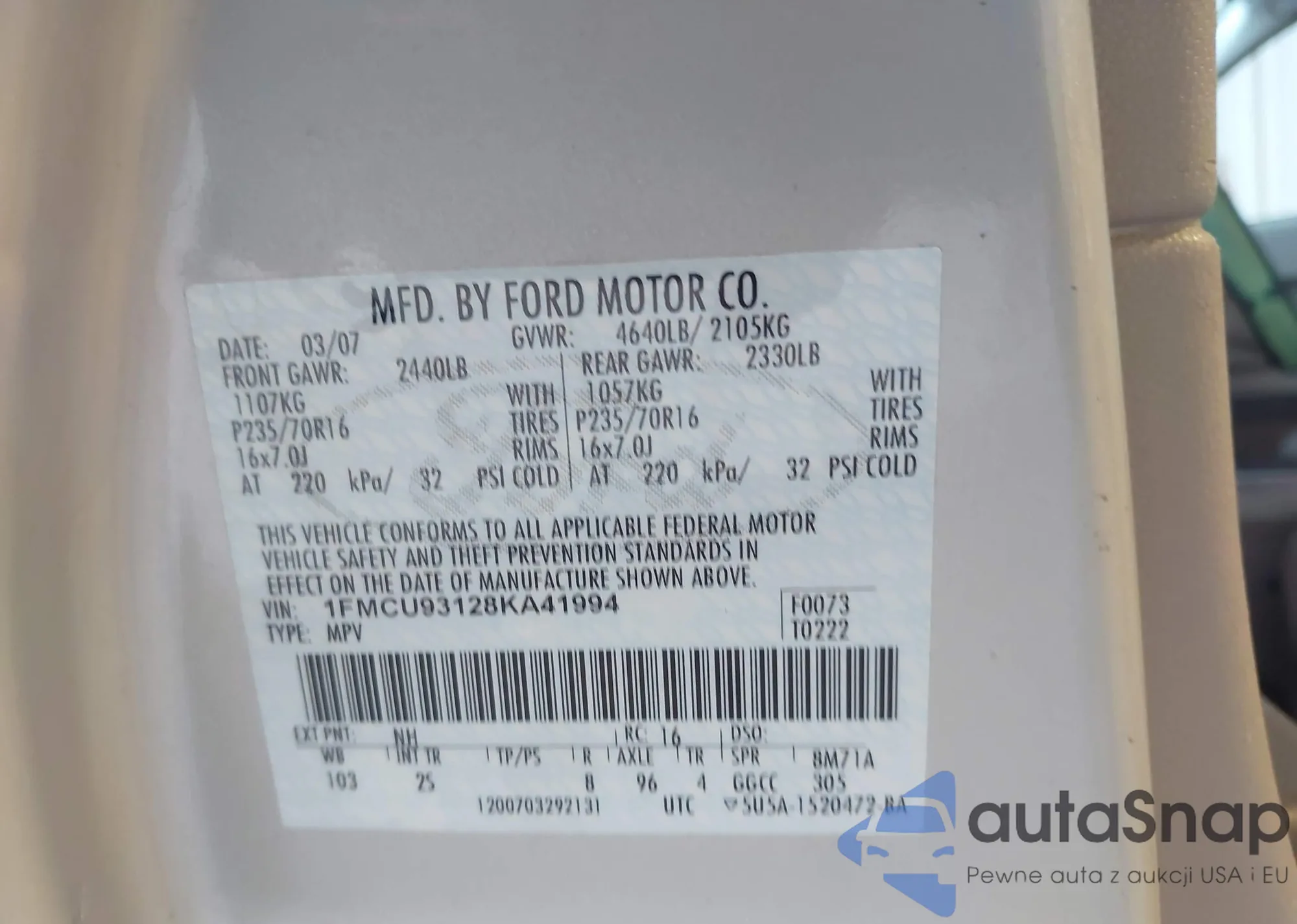 LOT: 43067632 VIN: 1FMCU93128KA41994