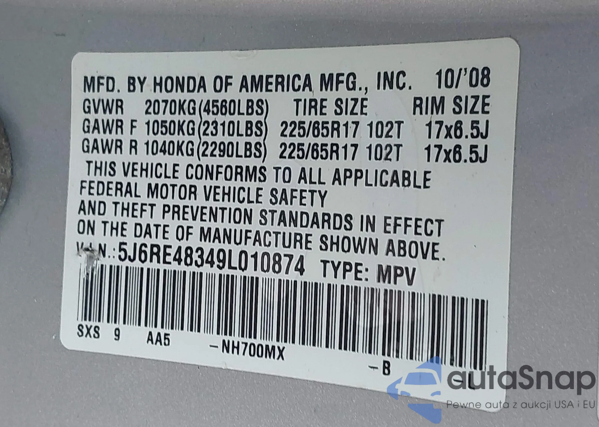 LOT: 42917879 VIN: 2HNYD28459H522717