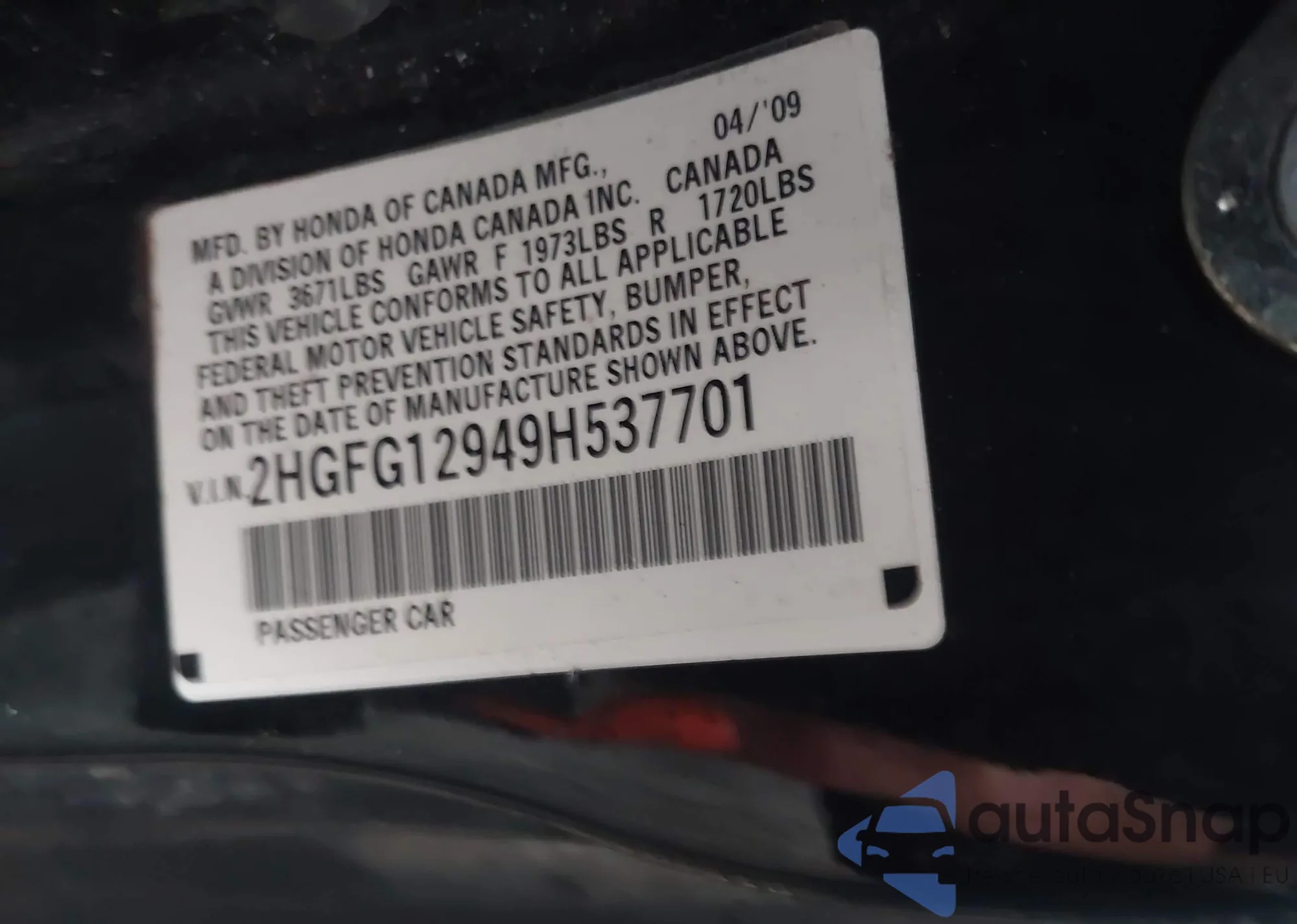 LOT: 42968886 VIN: 2HGFG12949H537701