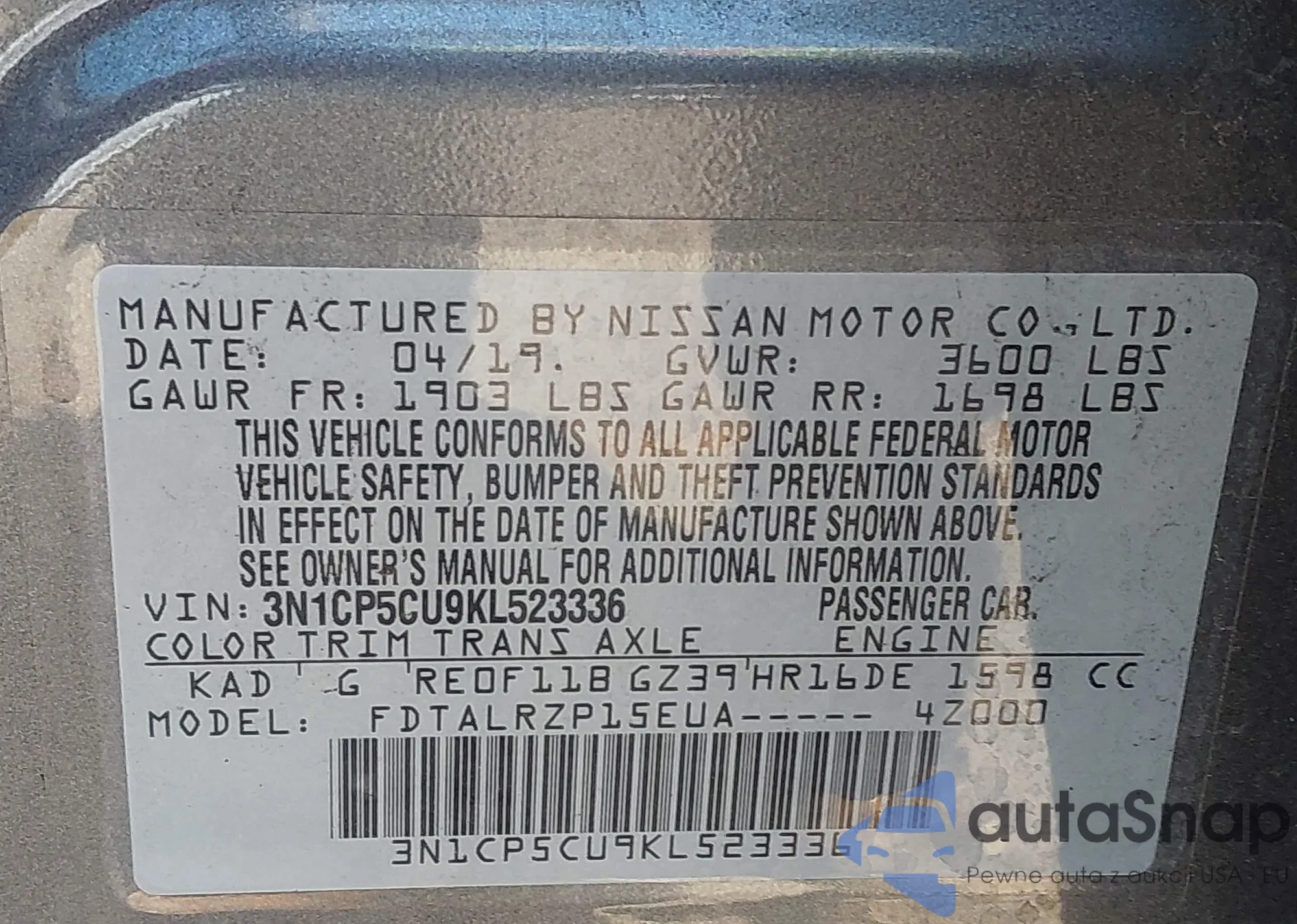 LOT: 42979653 VIN: 3N1CP5CU9KL523336