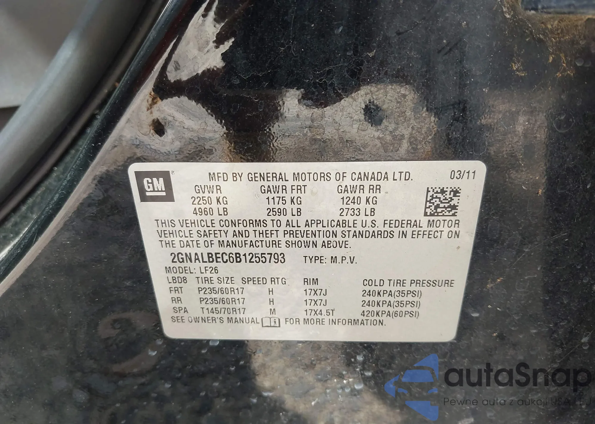 LOT: 43057670 VIN: 2GNALBEC6B1255793