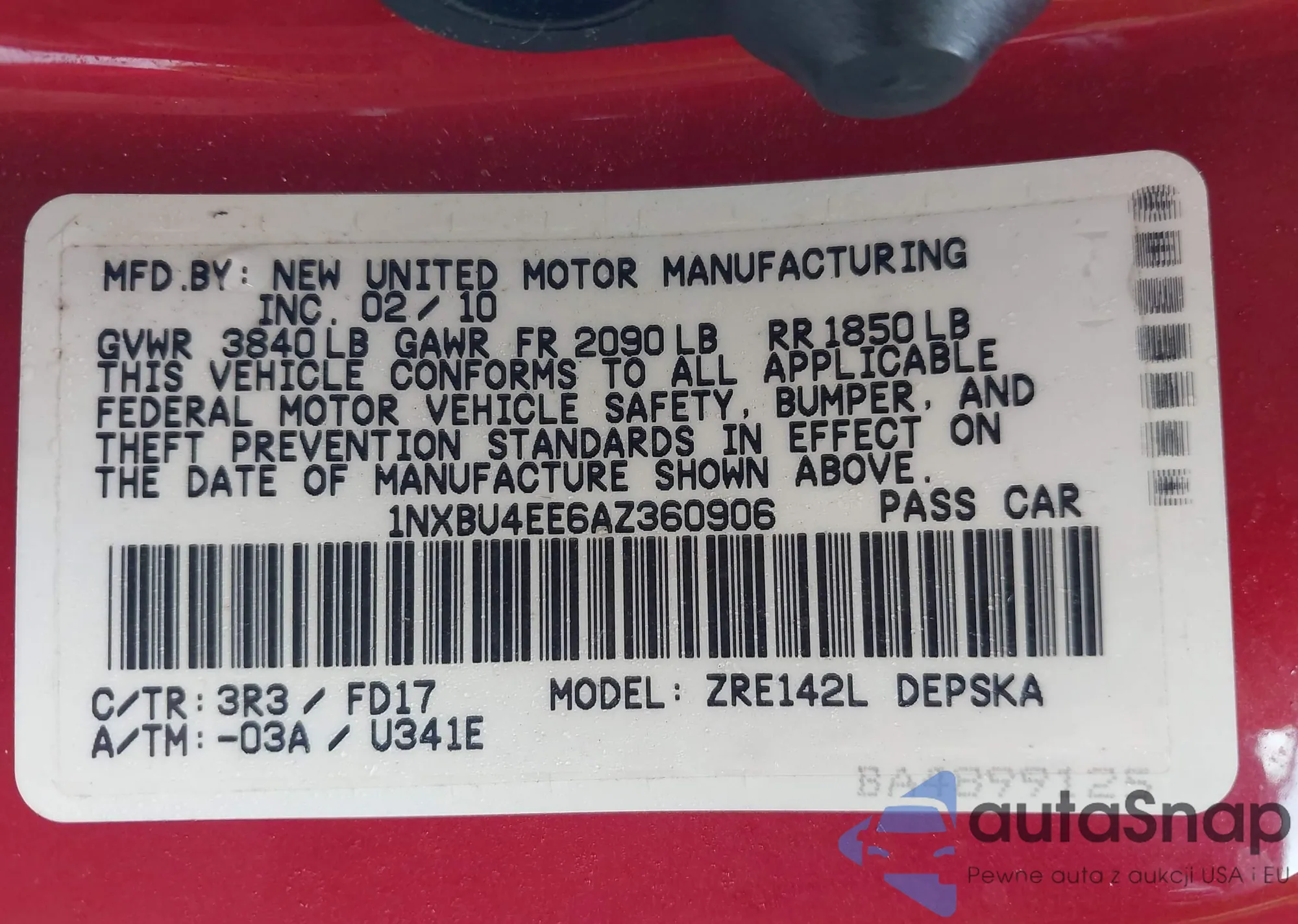 LOT: 43082948 VIN: 1NXBU4EE6AZ360906