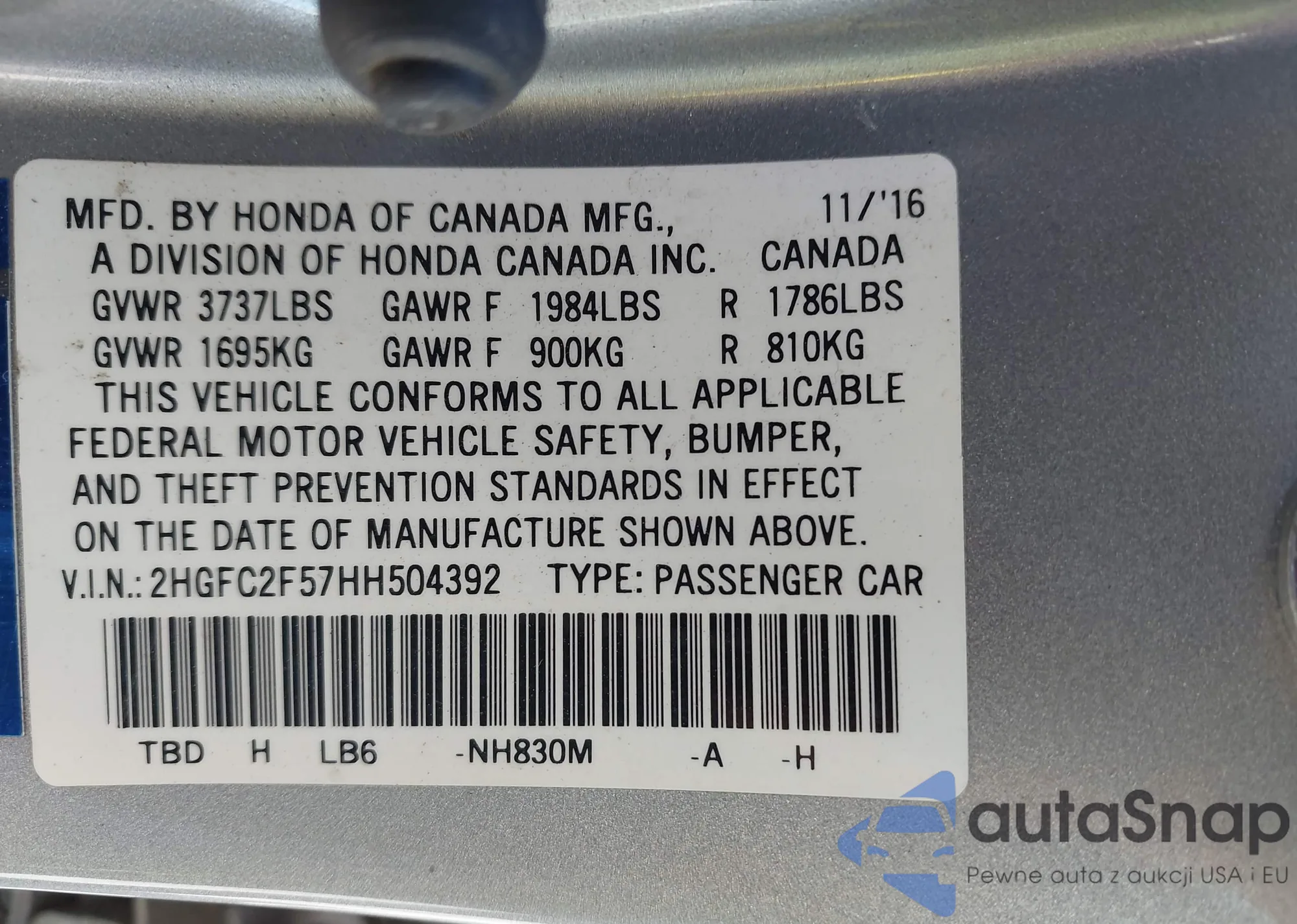 LOT: 43170890 VIN: 2HGFC2F57HH504392