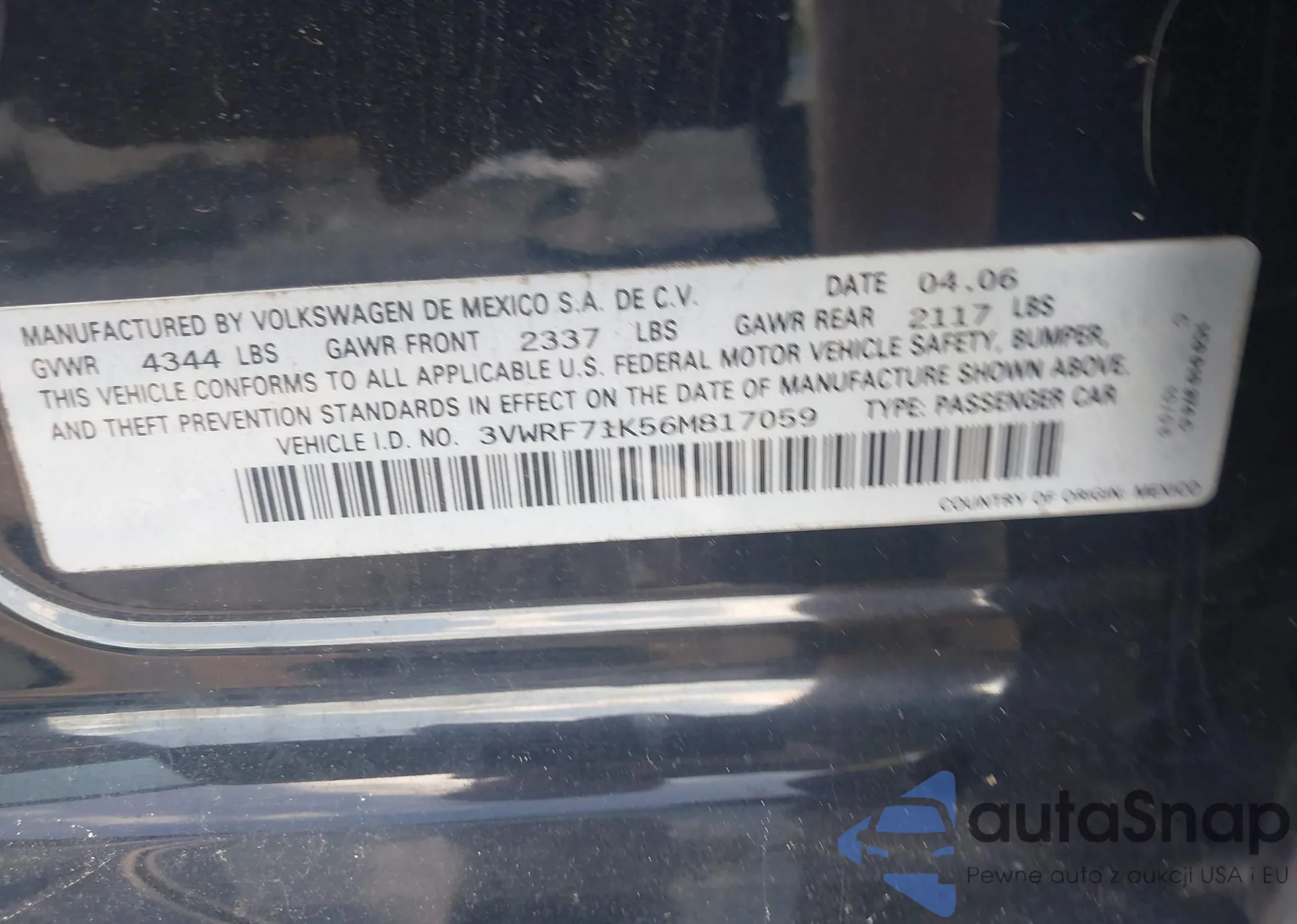 • VIN 3VWRF71K56M817059