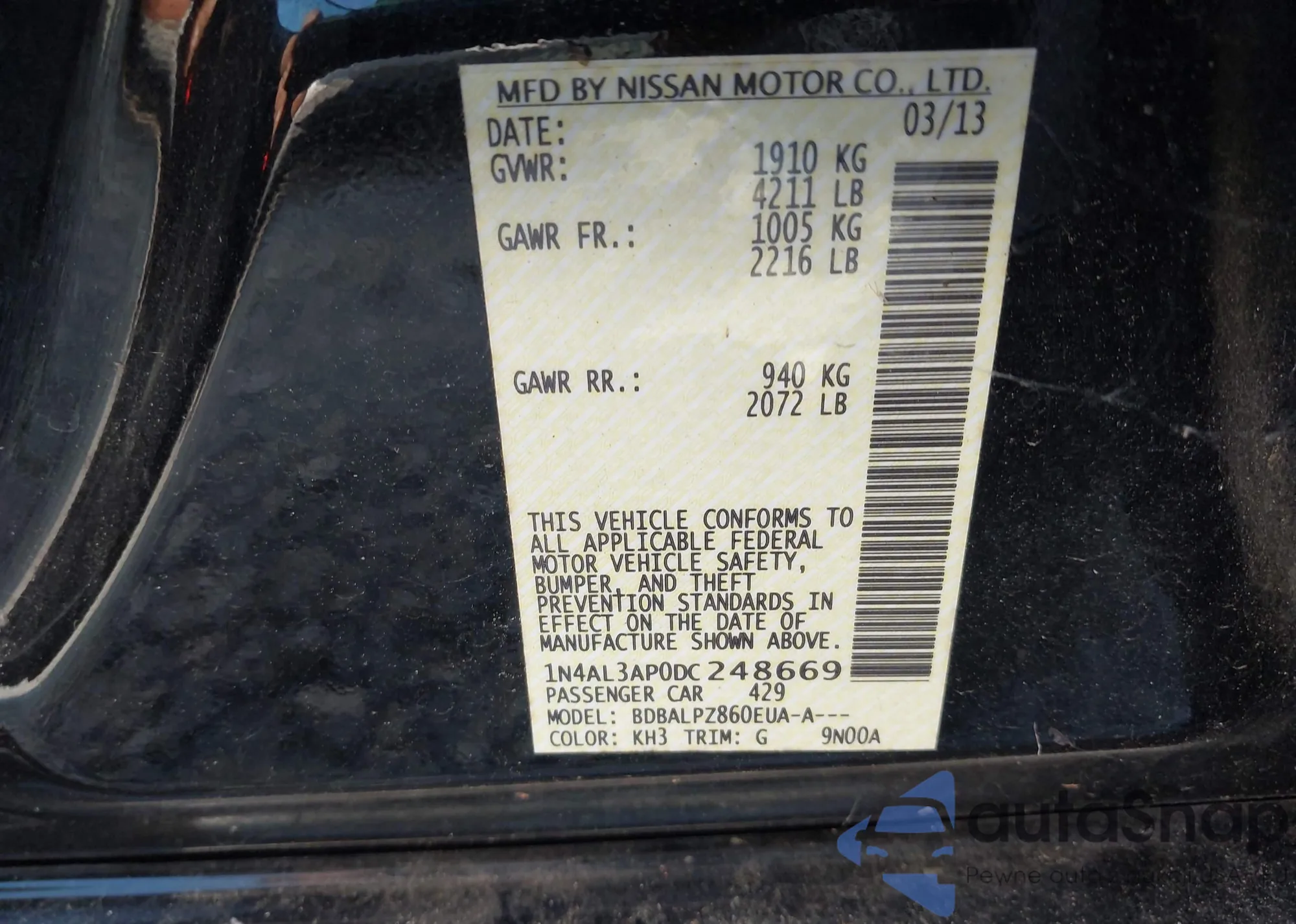 LOT: 43140010 VIN: 1N4BL4BV0KC244545