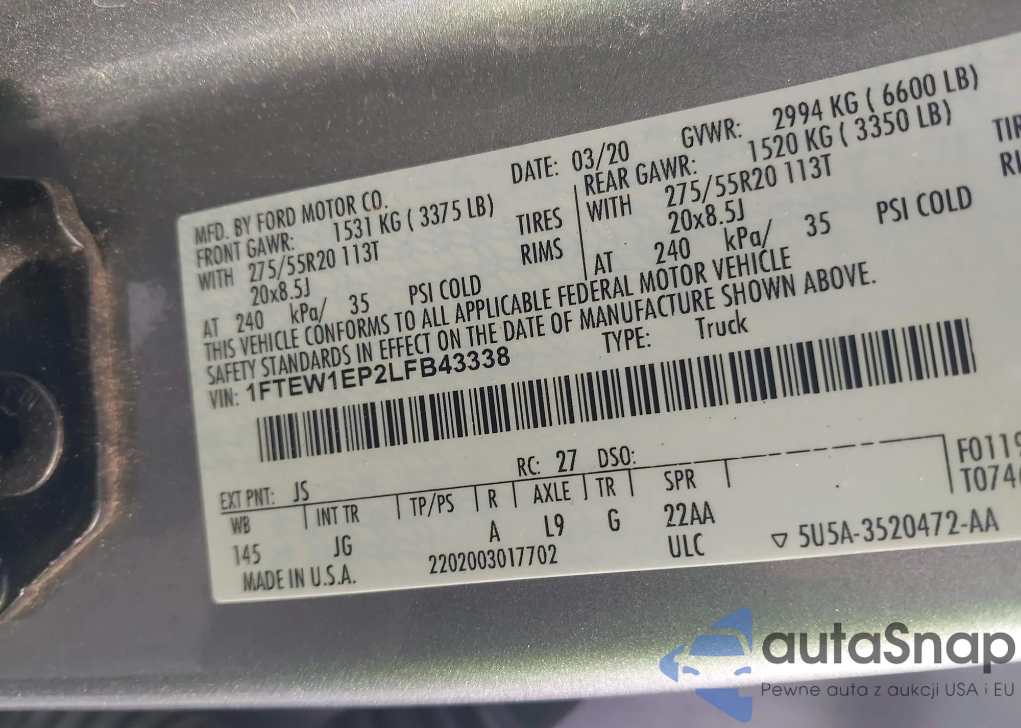 LOT: 42836647 VIN: 1FTEW1EP2LFB43338