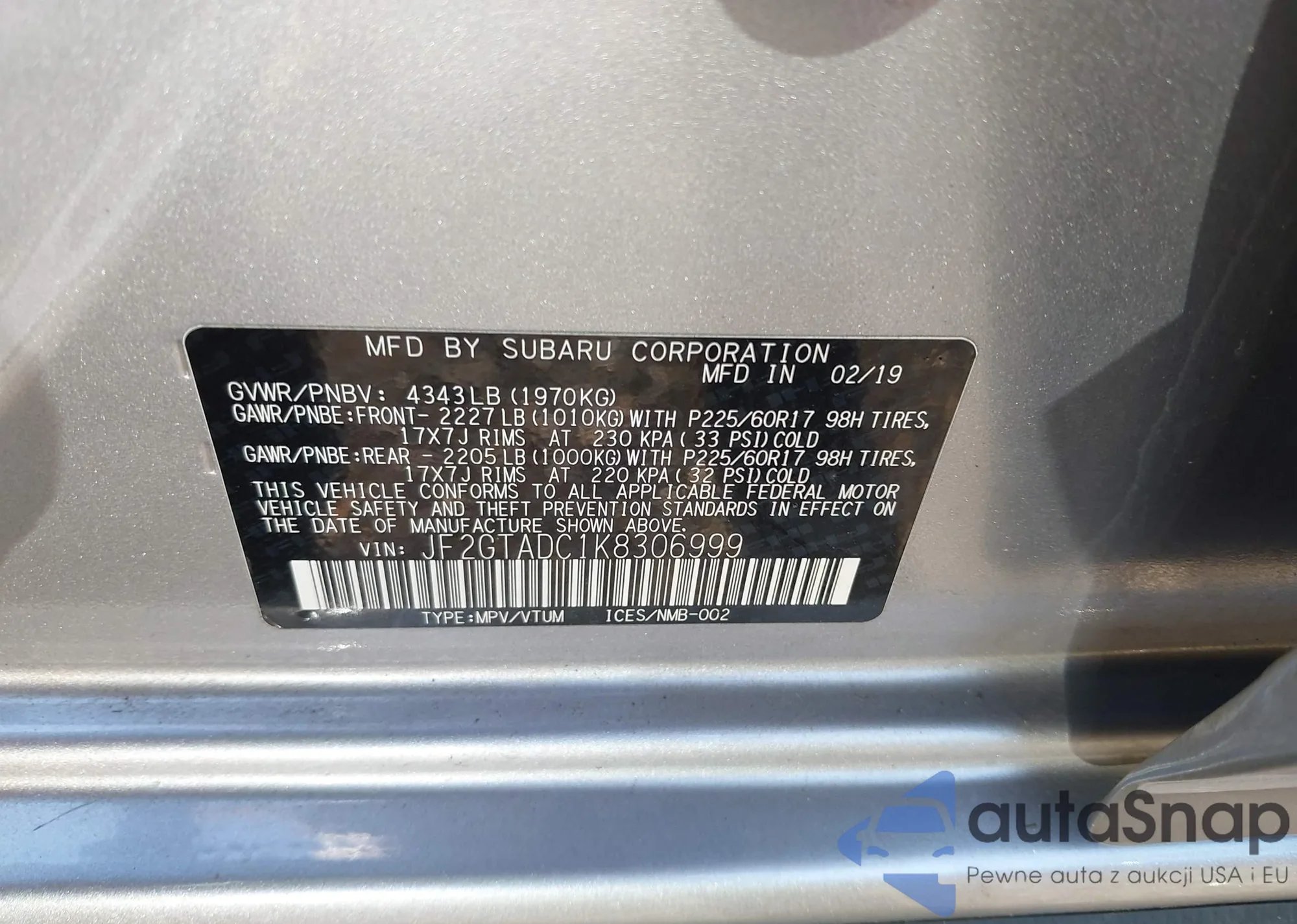 LOT: 43108997 VIN: JF2GTADC1K8306999