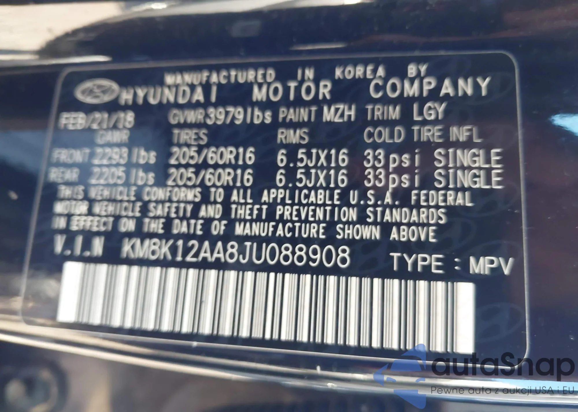 • VIN KM8K12AA8JU088908