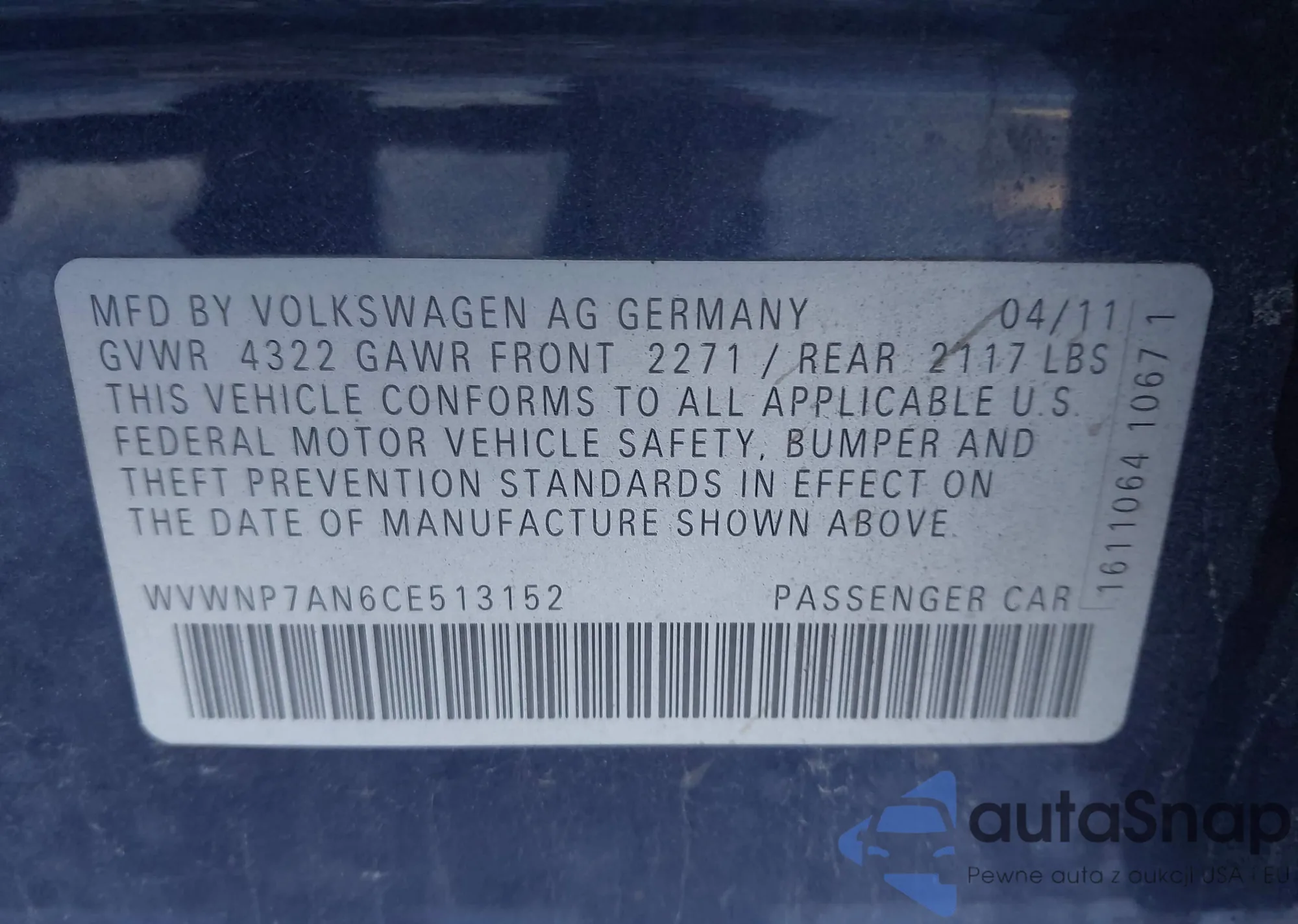 LOT: 43124125 VIN: WVWNP7AN6CE513152