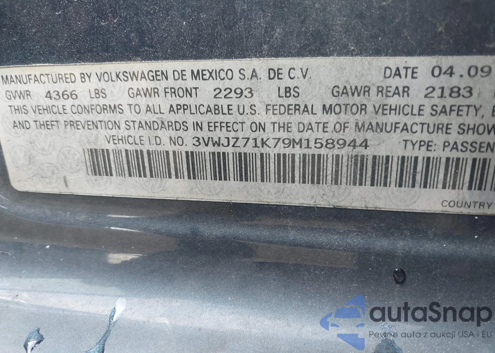 • VIN 3VWJZ71K79M158944