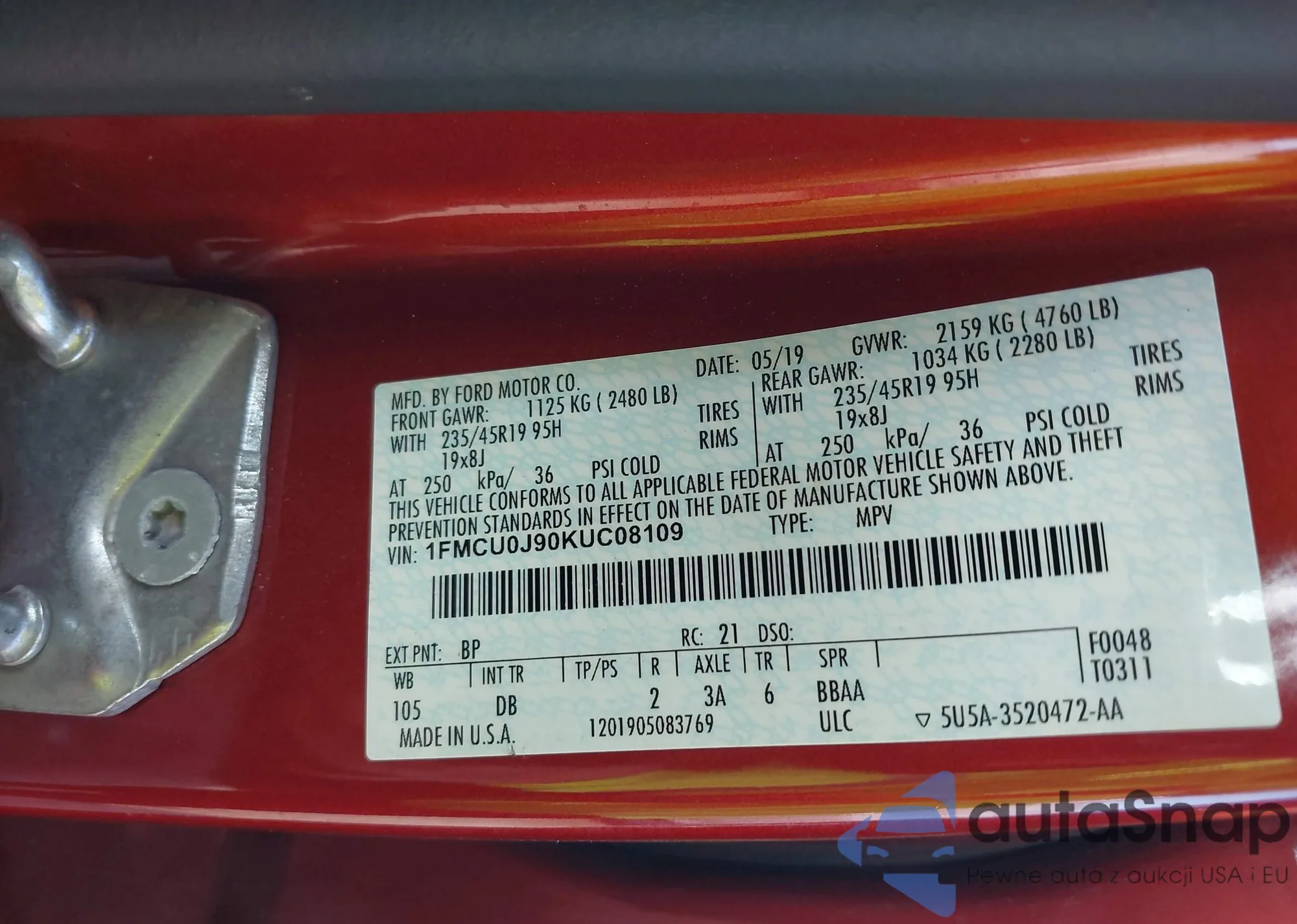 • VIN 1FMCU0J90KUC08109