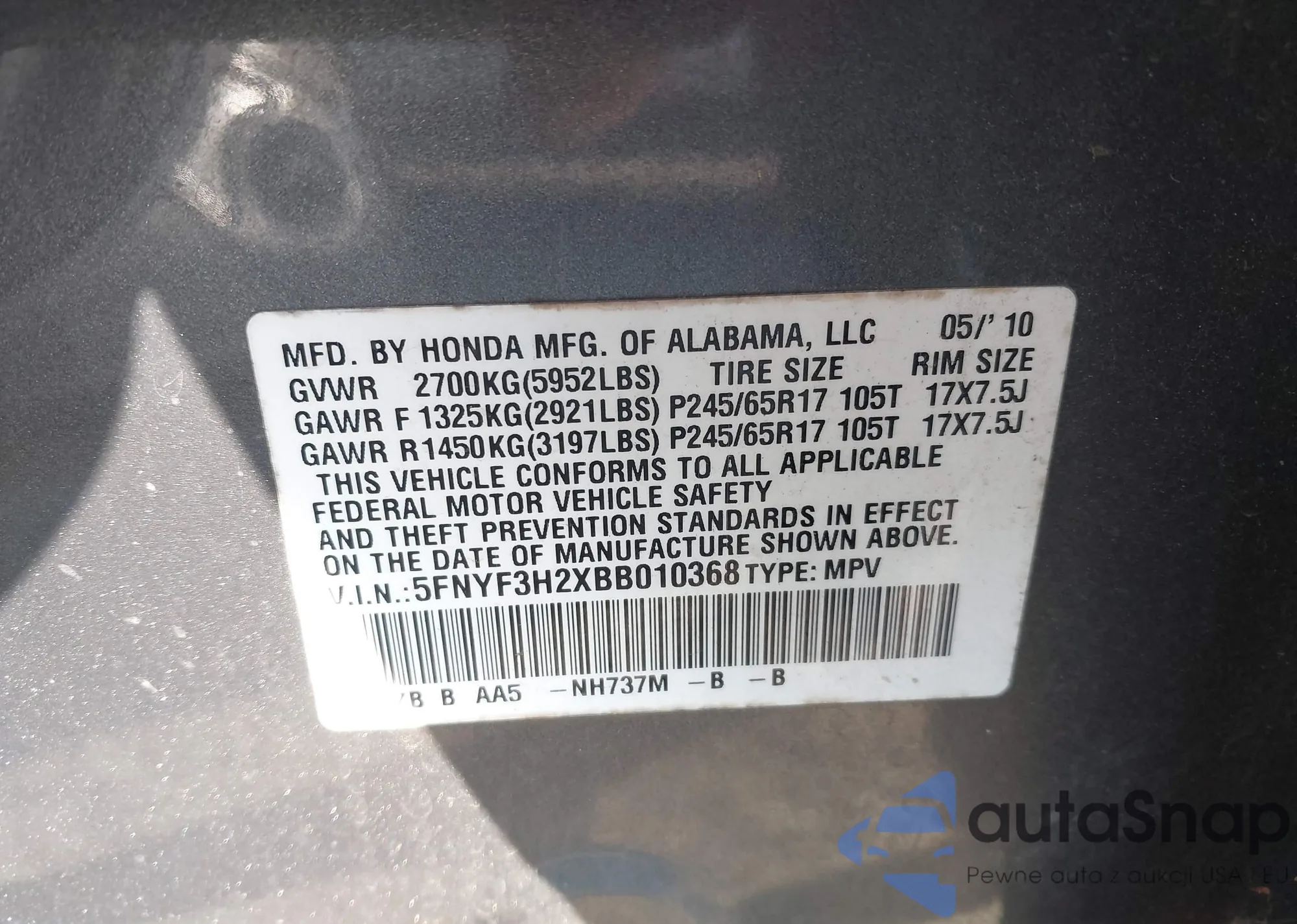 • VIN 5FNYF3H2XBB010368