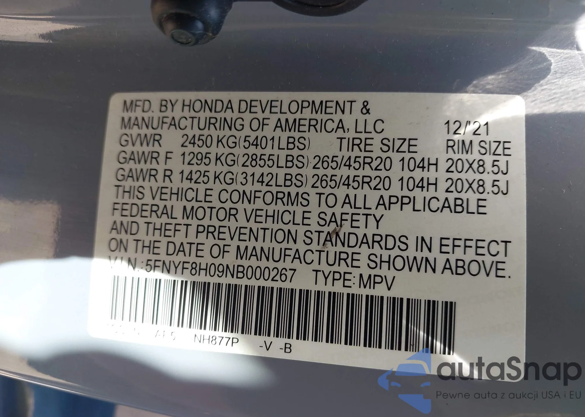LOT: 42816368 VIN: 5FNYF8H09NB000267