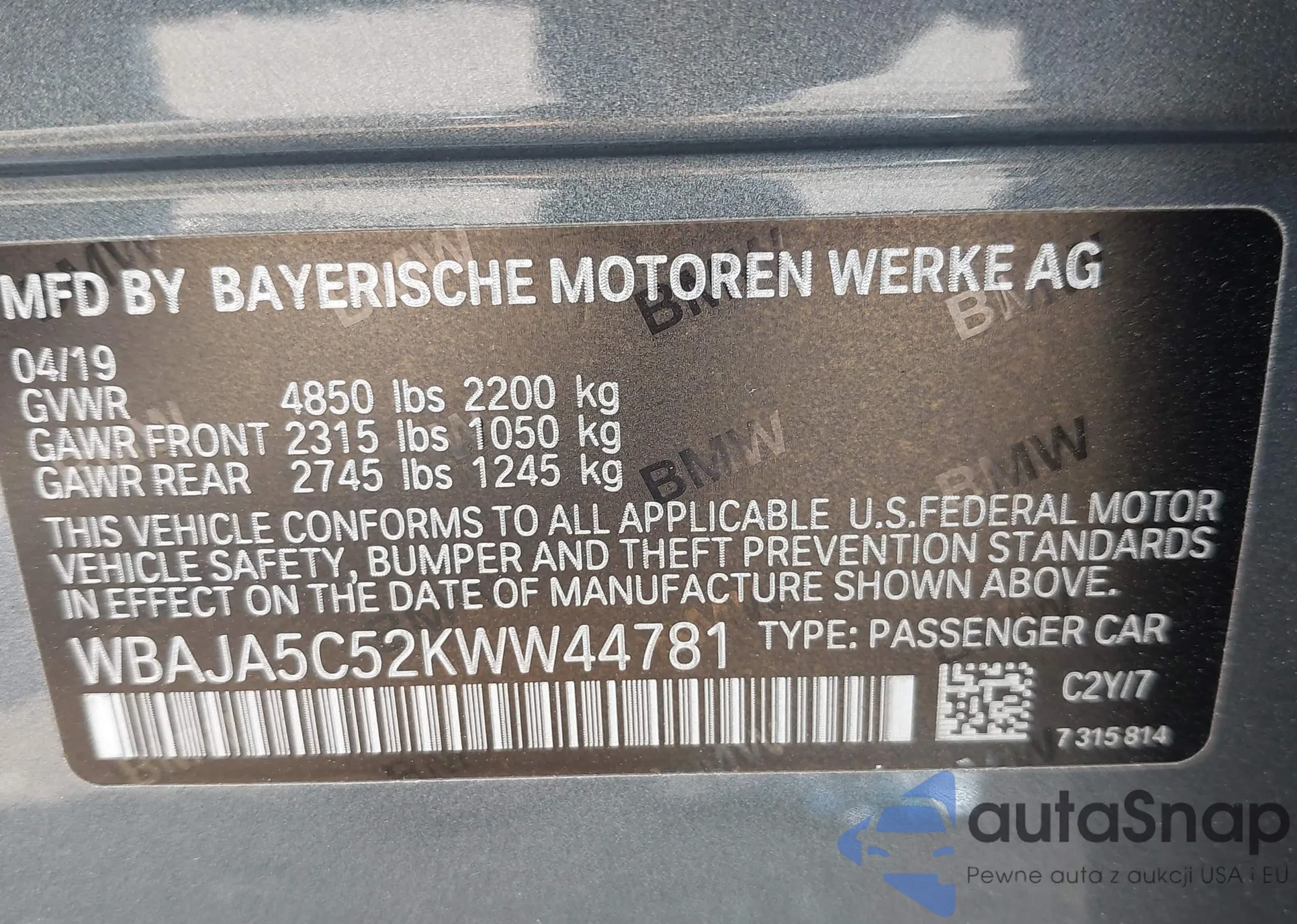 LOT: 42856522 VIN: WBAJA5C52KWW44781
