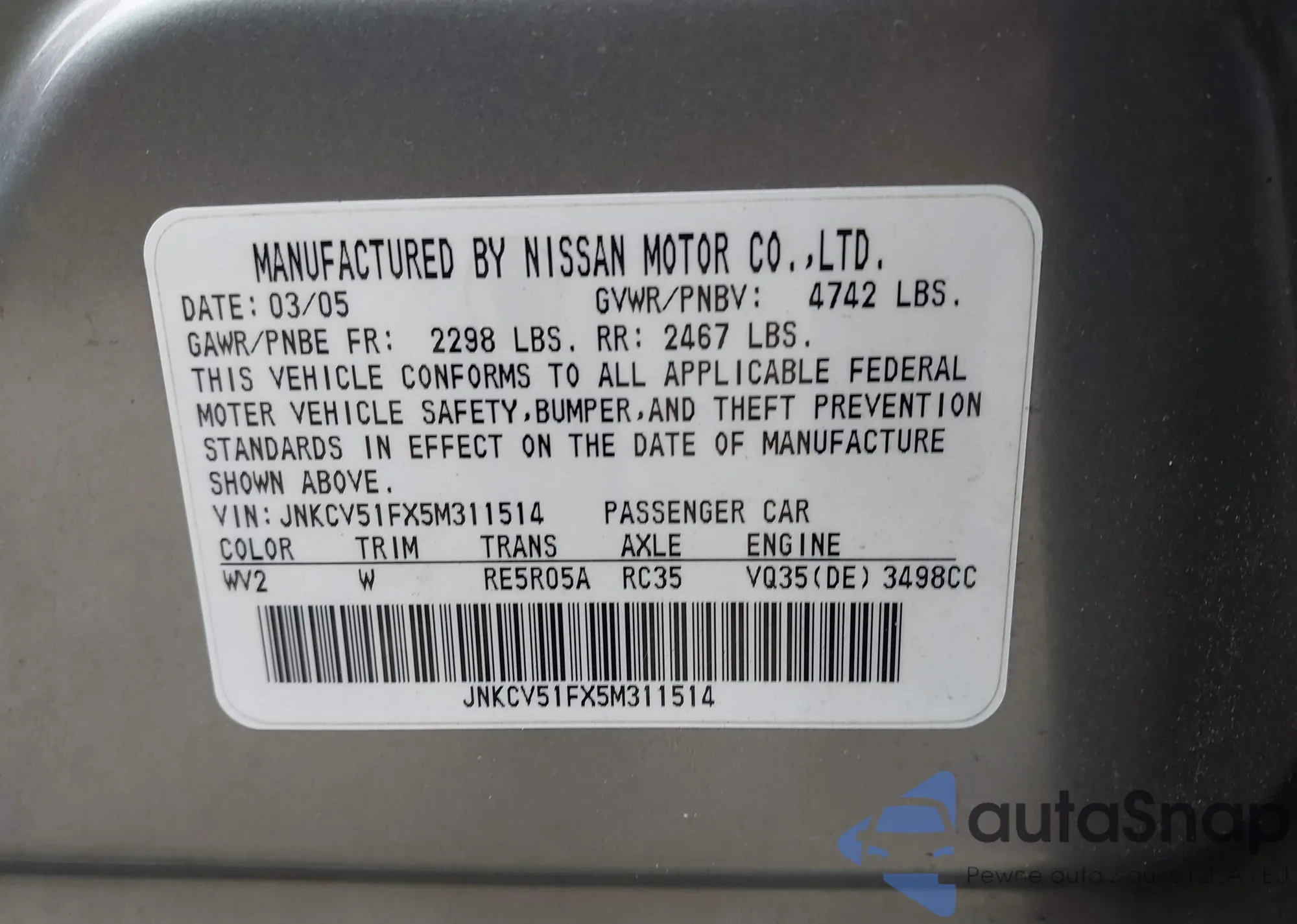LOT: 42959920 VIN: JNKCV51FX5M311514