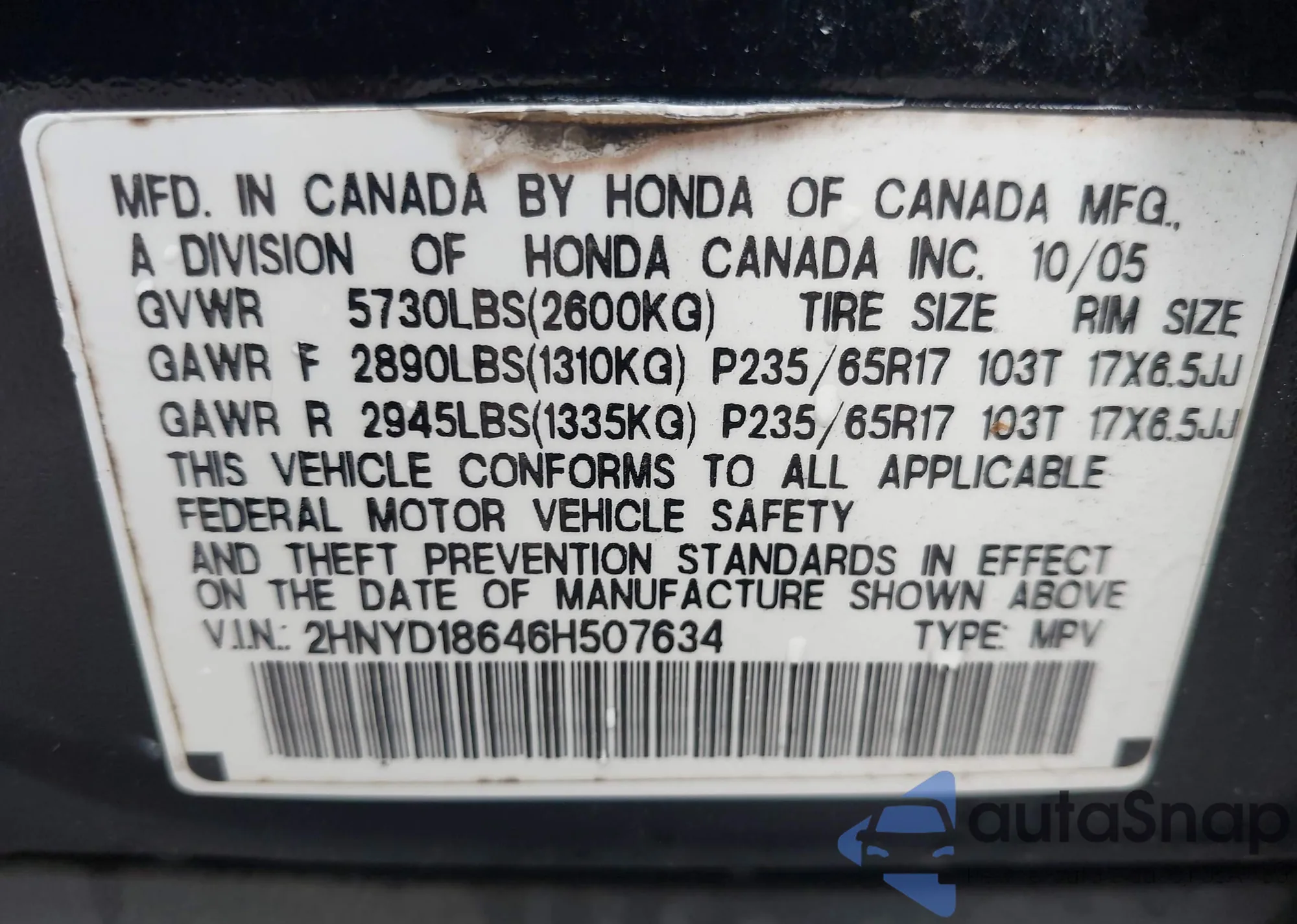 LOT: 43012057 VIN: 1HGCM66507A084513