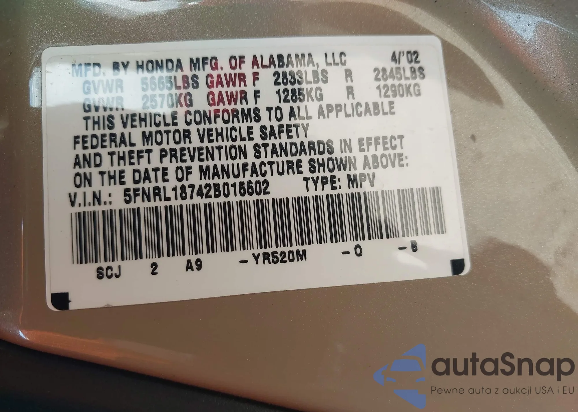 • VIN 5FNRL18742B016602